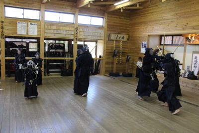 中2山本君が号令役を務めました。足さばきの稽古の後、7種類の素振りを30本ずつ行いました。15分間、日本剣道形と木刀による剣道基本技稽古法を修錬しました。面着け後は切り返し、小手面打ち、面体当たり引き面、面体当たり引き胴、小手面体当たり引き小手を行いました。