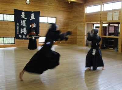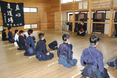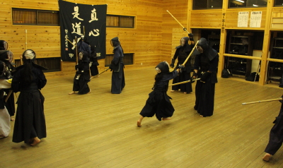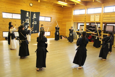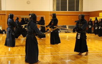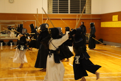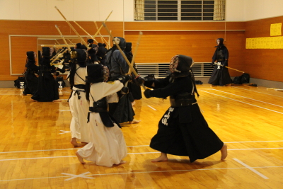 送り足、左手の片手素振りなどのほか、前進5本、後退5本の正面素振り、左右面素振りを何セットか行いました。腰で動く感覚が身についてきた館生も少数派ですが出てきたように感じます。