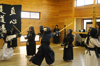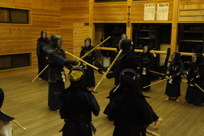 面着け後は切り返し、小手面打ちを主に行った後、20〜30秒の地稽古を2〜3回、一般は1分間の地稽古を2回行いました。70代の先生同士の立ち合いが最も気迫があふれていて、お互いに積極的な攻めと技が出ていました。ほかの指導者も館生も見習わなければならないことでしょう。