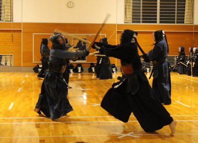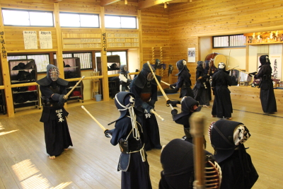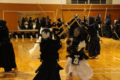 面着け後は指導者・一般、高校生元立ちで3回往復の切り返し、面−小手面3セットの打ち込みを行い、一般は50秒、高学年以上は30秒、低学年以下は20秒の地稽古をそれぞれ3回ずつ行い、切り返しで納めました。