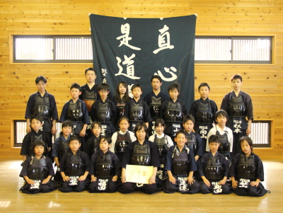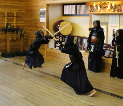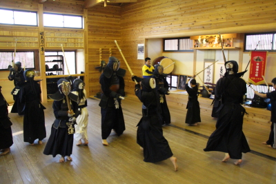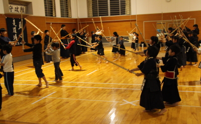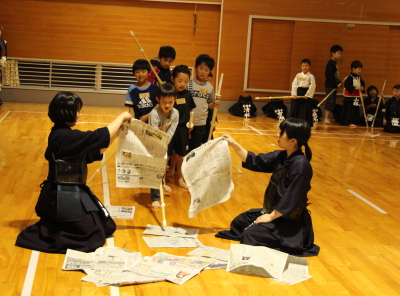 | 甲斐市剣道体験教室の第4回と甲斐直心館の合同稽古会を4月20日、玉幡中学校武道場で開きました。 剣道体験教室の約15人を含め、全体では50人を超える参加がありました。 前回は正面素振りを200本行いましたが、それを超える250本を行いました。これは過去何年かの剣道体験教室では経験したことがない本数だと思います。今回の参加者は先生方のご指導もあって覚えが非常に早く、それなりの形になっています。体験教室参加者のうちこれまでみんなの前で素振りを披露していなかった子どもたちに20本素振りをしてもらいましたので、多い子どもは270本を振っています。 送り足、スキップ、踏み込み足などの稽古を行った後、お楽しみのボール投げ、経験者はボール打ちを行いました。 ボール投げの時はサッカーのスローインの要領で振りかぶって「めん!」の気合とともに右足を出しながら投げます。ボール打ちは木刀の物打ちでボールが少しずつ前に出るように打ちながら送り足で進みます。 この教室では初めて竹刀による新聞紙切りを行いました。最初に山口先生に示範してもらい、力ではなく、「冴え」によって切れることを観察してもらいました。 学年別に3グループに分かれて行いました。すっと真ん中を切れる館生もいれば、いわゆる刃筋(はすじ)が通らず、ぶちゃっと引きちぎれてしまう館生もいました。1度目、2度目とも一度で切れた人は正しい振りができている、と自信をもっていいと思います。 驚きだったのが、あまり剣道経験もない体験教室参加者の「切れ」が良かったことです。女性指導者たちの教えもよかったのでしょうが、低学年以下の子どもたちが「思い切り振っても駄目だよ」「すっと振るといいよ」などという意味のことを互いにアドバイスしながら、上手に切っていました。やはり何事も努力、研究、工夫が大切です。これは経験の多寡(たか=多い少ない)によりません。直心(すなおな心)が大切です。 最後は5年生以上の12人に面を着けてもらい、面打ち、小手面打ちを披露してもらった後、面打ち、小手面打ちを元立ちになって受けてもらいました。大きな声でしっかり踏み込みながら打てる体験生、館生も増えてきています。 体験生、館生とも手を挙げて10人を超える感想発表がありました。幼児から70歳代まで異年齢が集う空間で、みんなが同じ空気を共有する、同じことを楽しむ。剣道の素晴らしさをあらためて感じた時間でした。剣道体験教室は25日で修了となります。あっという間の2週間です。 にほんブログ村 人気ブログランキングへ |