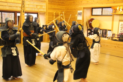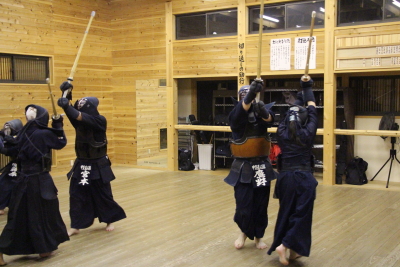 素振りは正面、左右面、小手、左手の片手素振り、右手の片手素振り、左右胴素振りを各30本、跳躍面素振りを50本の計230本行いました。