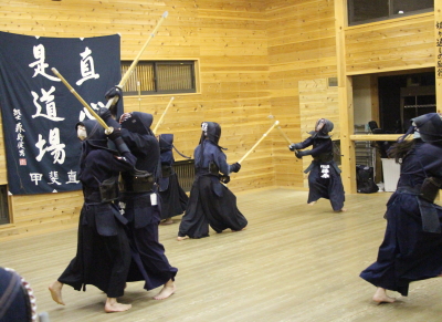 面着け後は全員で切り返し、面の打ち込みを行い、15秒間の相掛かりを二グループに分けて行いました。滑りやすい床の上で思うような動きはなかなかできませんが、足をしっかり動かして体を安定させることにそれぞれ努めました。
