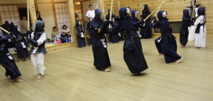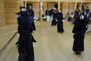 水分補給後、面を着けました。切り返しを行い、3〜4人一組になって2人の元立ちに対して連続踏み込み面、引き面の連続、元立ちの小手に対する相小手面(あいこてめん)、引き小手、引き胴の連続、元立ちの面に対する出小手打ちなどを行いました。