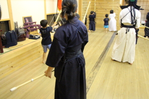 小6望月君の号令で正座。とても大きな、よく通る声です。足さばきの稽古の後、正面素振り50本、左右面素振り50本、跳躍面素振り100本、小手素振り50本、左右胴素振り50本を行いました。面も、小手も、胴も打った時の左手の高さがいつも同じであるという癖から抜けられない館生が若干、見受けられます。目の前にいる相手の打突部位をしっかり打つという意識を持つか持たないかで空間打突の意味は大きく違ってきます。