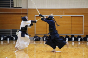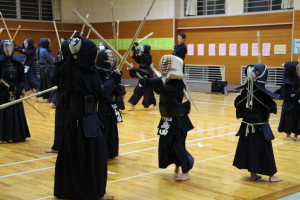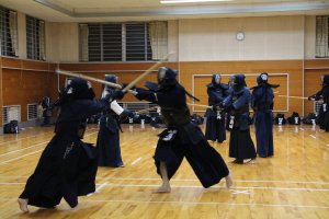 面着け後は2回往復の切り返し、3〜4人一組になっての面打ち−体当たり引き技のパターン稽古、小手面−体当たり引き技の連続パターン稽古を行いました。また1人が元立ちになり、3〜4人が連続して掛かっていく掛かり稽古に対する応じ技の稽古を行いました。