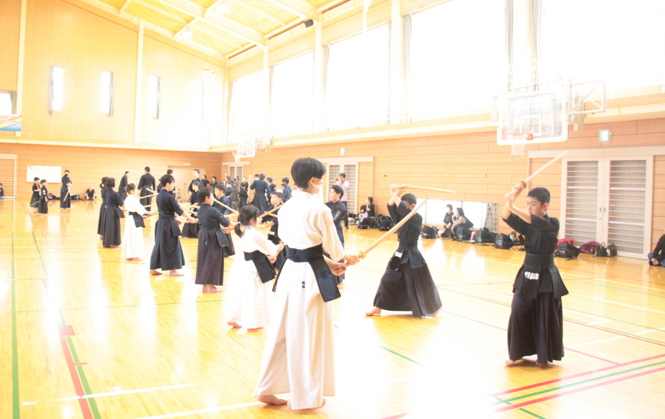 小学校3〜6年生は22人でしたので、11人ずつ2グループに分け、切り返しや基本打ちをしてから試合稽古を行いました。