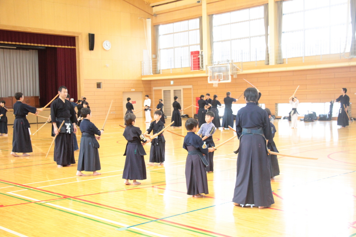 打ち込みの後は、初心者も含め、地稽古を行いました。面を着けて初めて、2回目のお父さん方も基本に忠実な打ちを繰り出していて、うれしくなりました。中学生・一般が45秒地稽古を2回、小学生以下が3回地稽古を行いました。左脚が跳ね足になっている癖のある人は早めに直していきましょう。左足は床を蹴る足ではなく、踏み切り足です。
