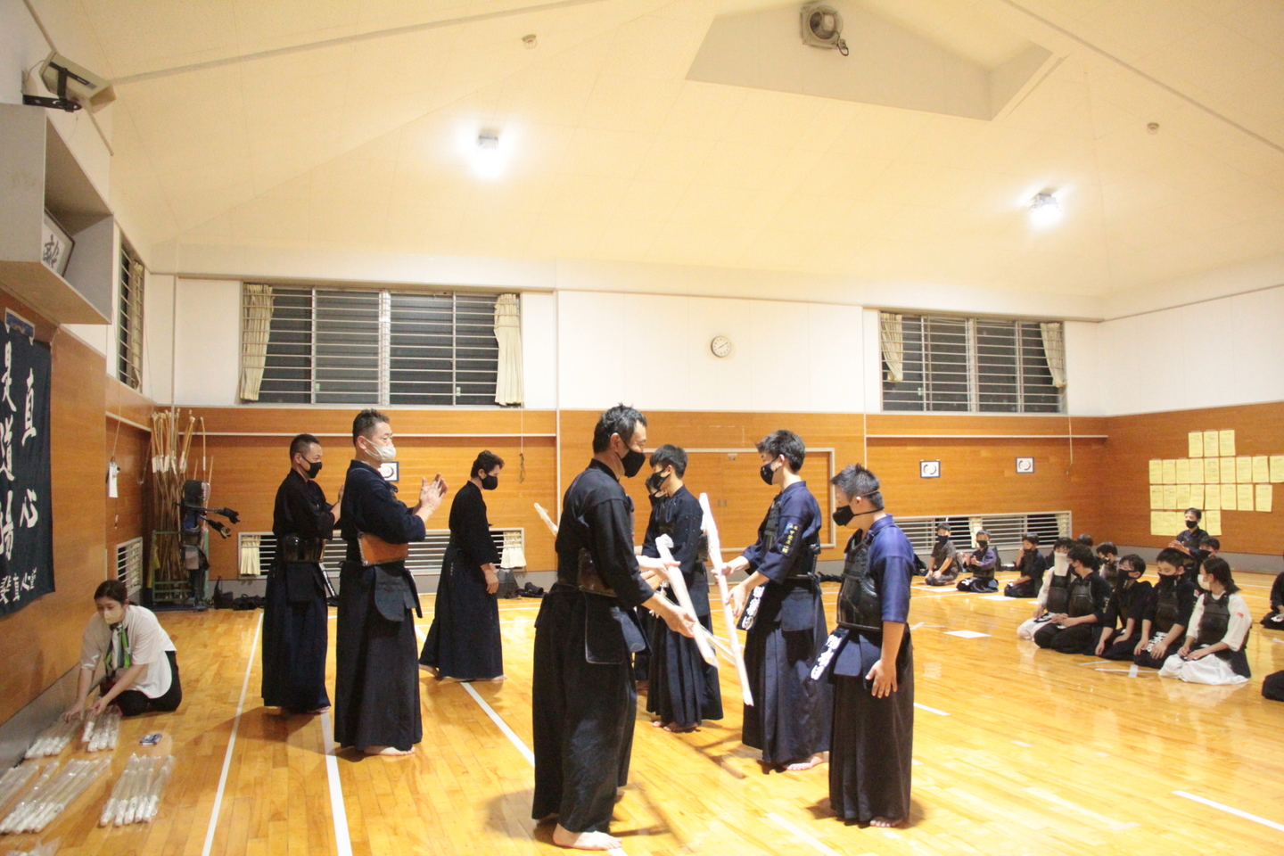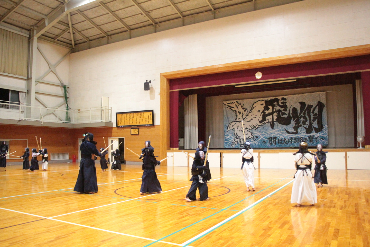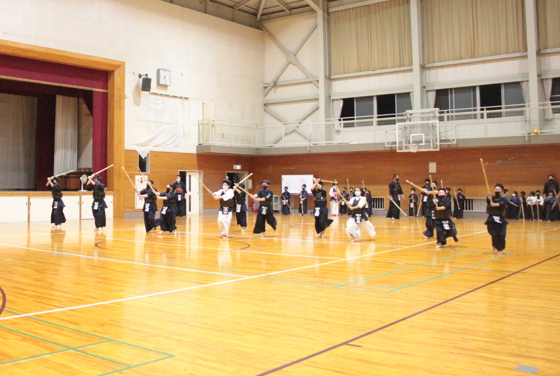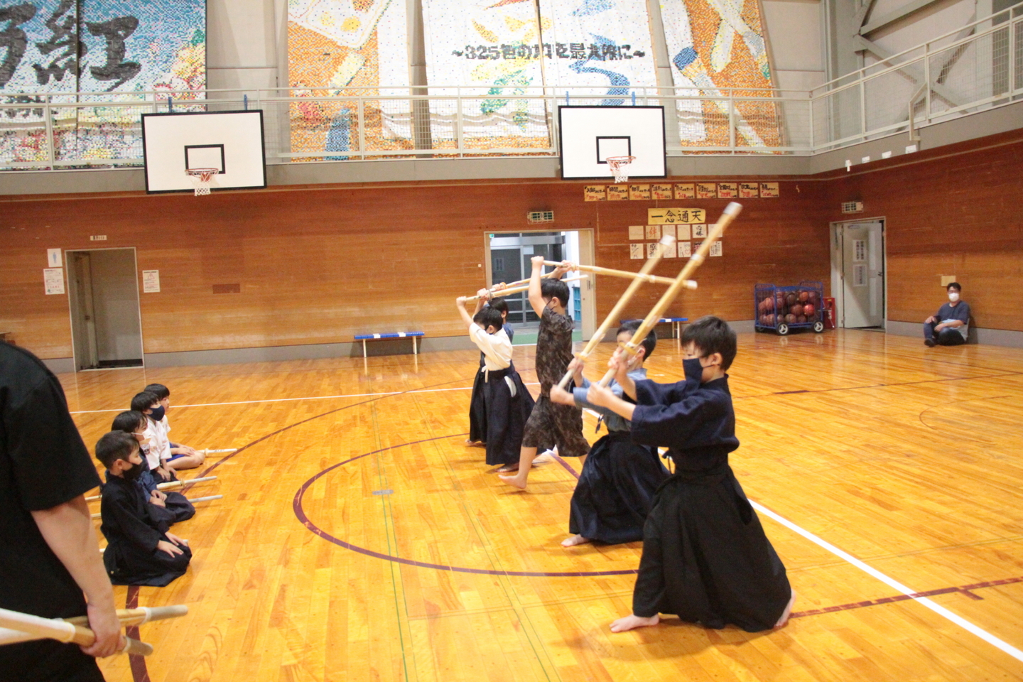 足さばきを行い、体育館の白いラインに合わせて空間打突を行いました。ラインの上で踏み込めている人、ラインを過ぎてから動作を起こしている人など、それぞれの個性が如実に分かります。