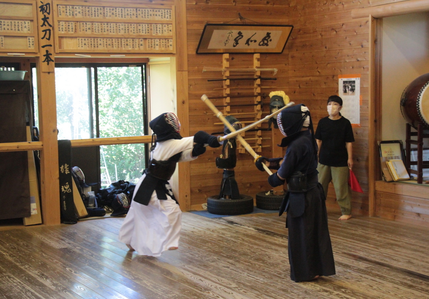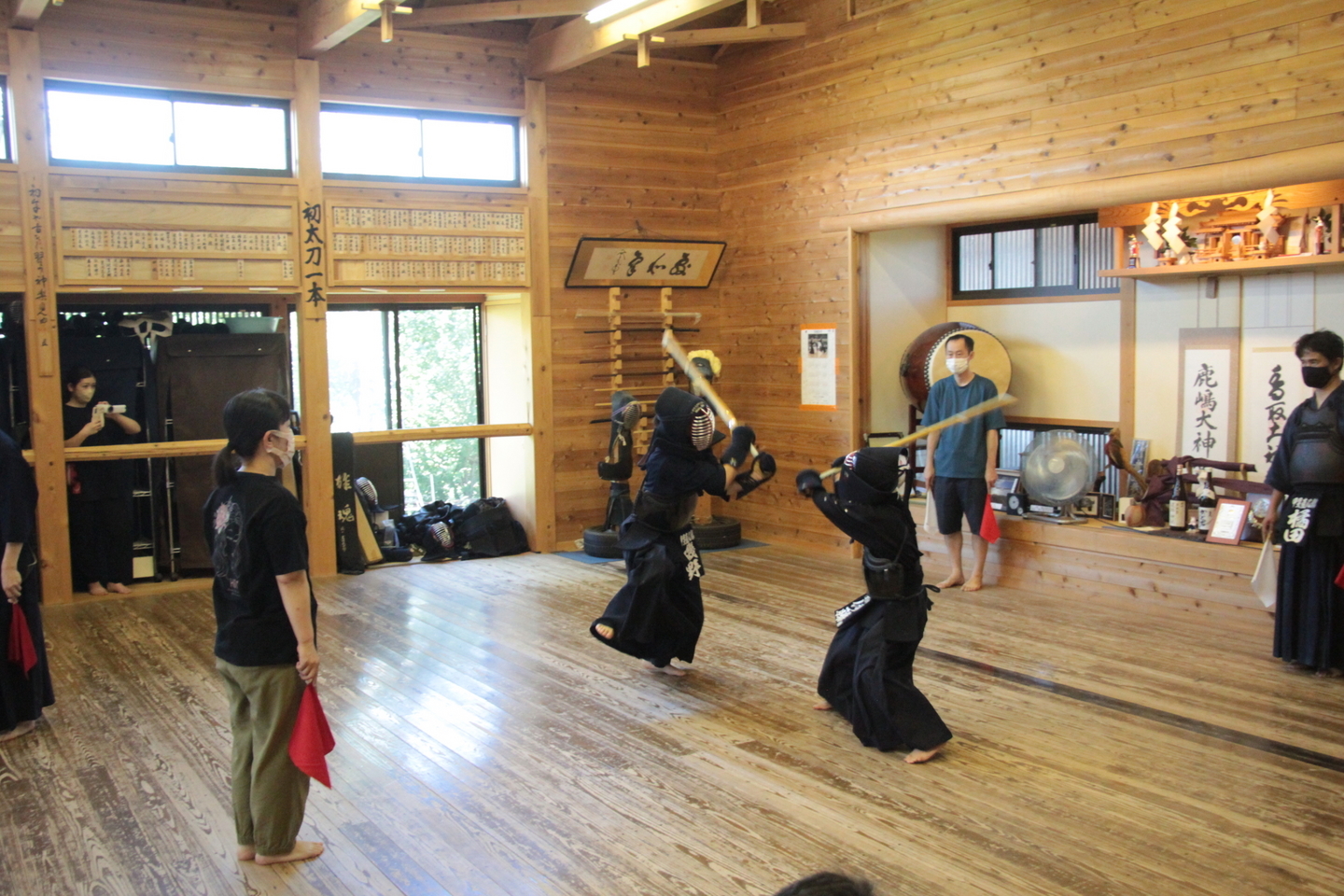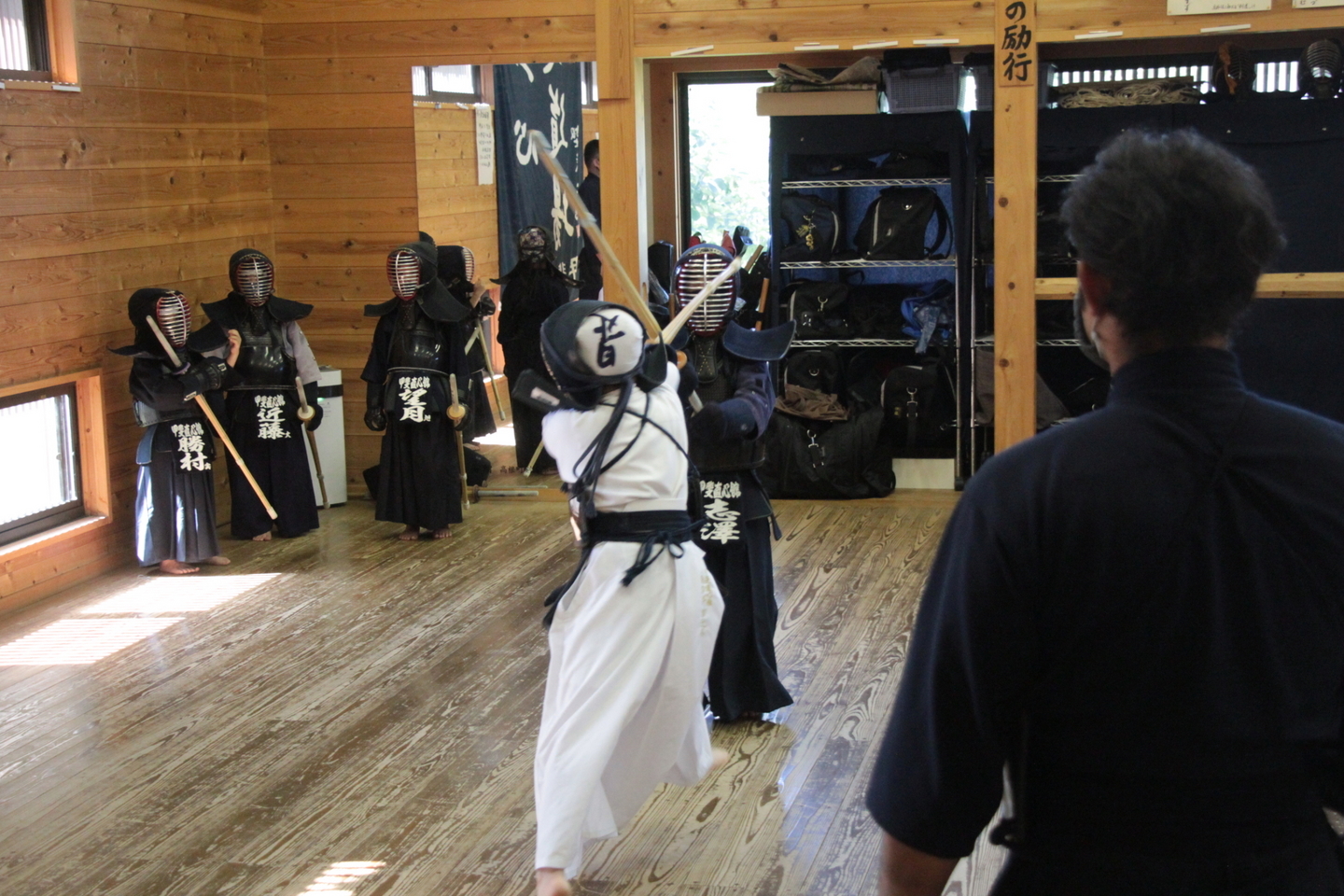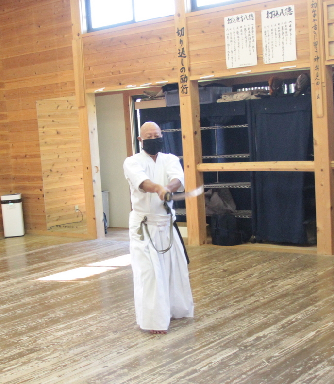 足さばきを行い、体育館の白いラインに合わせて空間打突を行いました。ラインの上で踏み込めている人、ラインを過ぎてから動作を起こしている人など、それぞれの個性が如実に分かります。