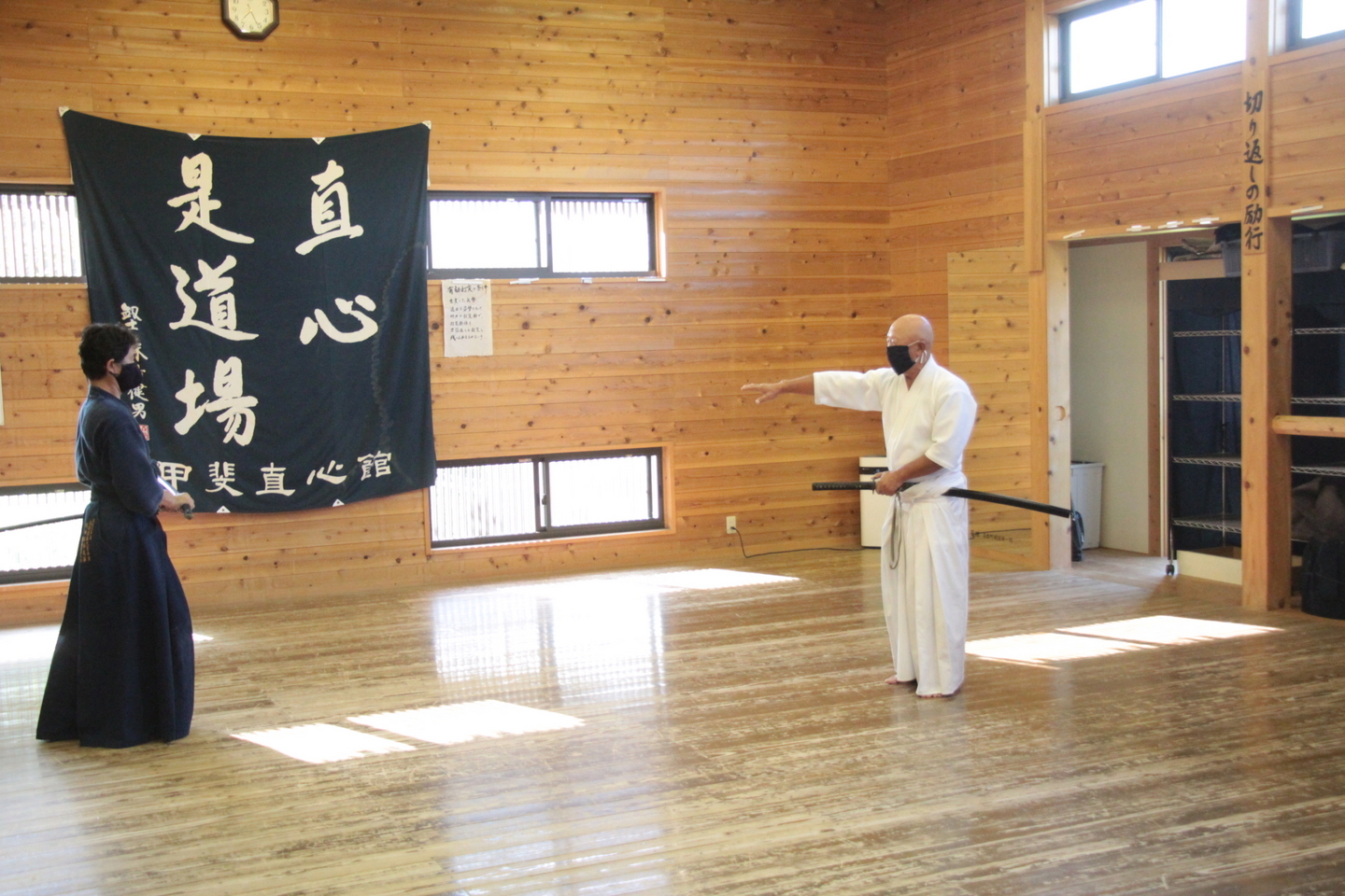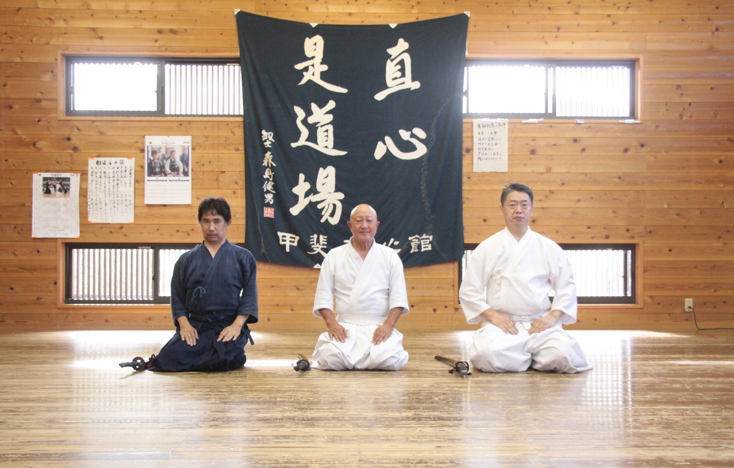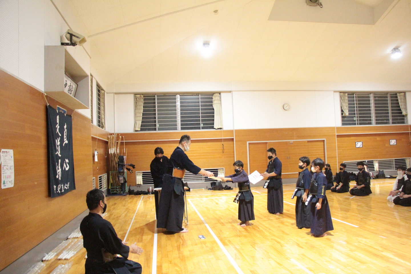 面着け後は切り返し、相面、相小手面を行い、30秒程度の地稽古、最後に中学生も元立ちに加わっての打ち込み稽古、切り返し、面一本で締めました。 まだ面を着けていない初心者組は、6、7級審査要領の内容を中心に稽古しました。 終わりの正座では本部審査会の級位合格者に証書を手渡しました。夏休みの竹刀を全員に贈りました。 また、甲斐直心館の今年のスポーツ少年団登録が無事に完了し、団員は53人(中学生以下50人、高校生3人)を登録し、団員章が届きましたので配布しました。