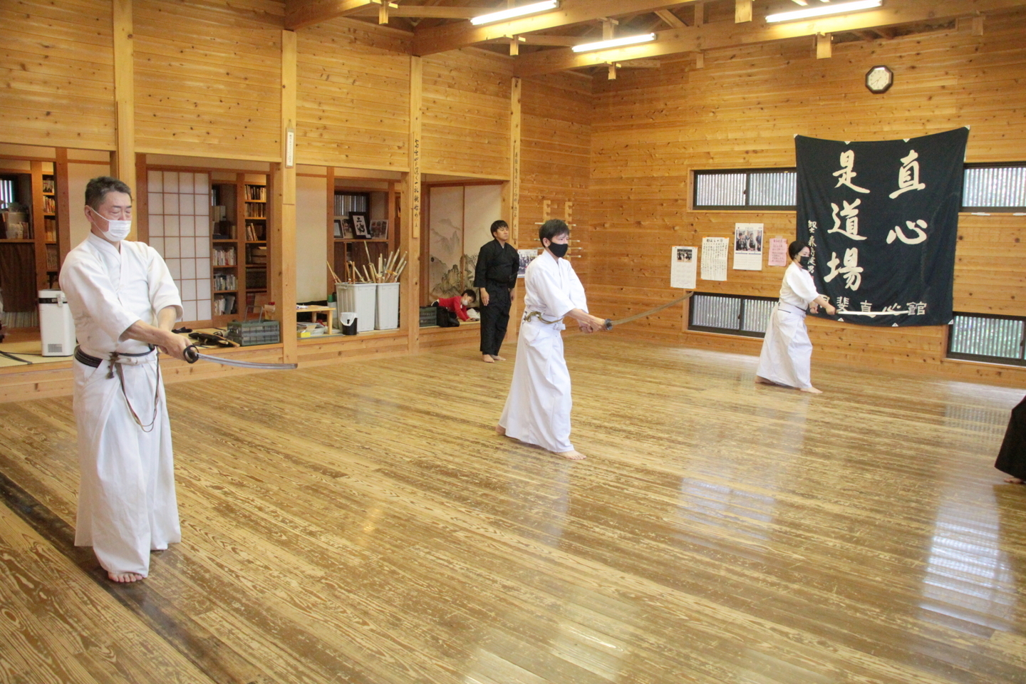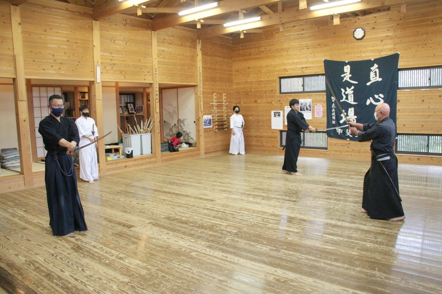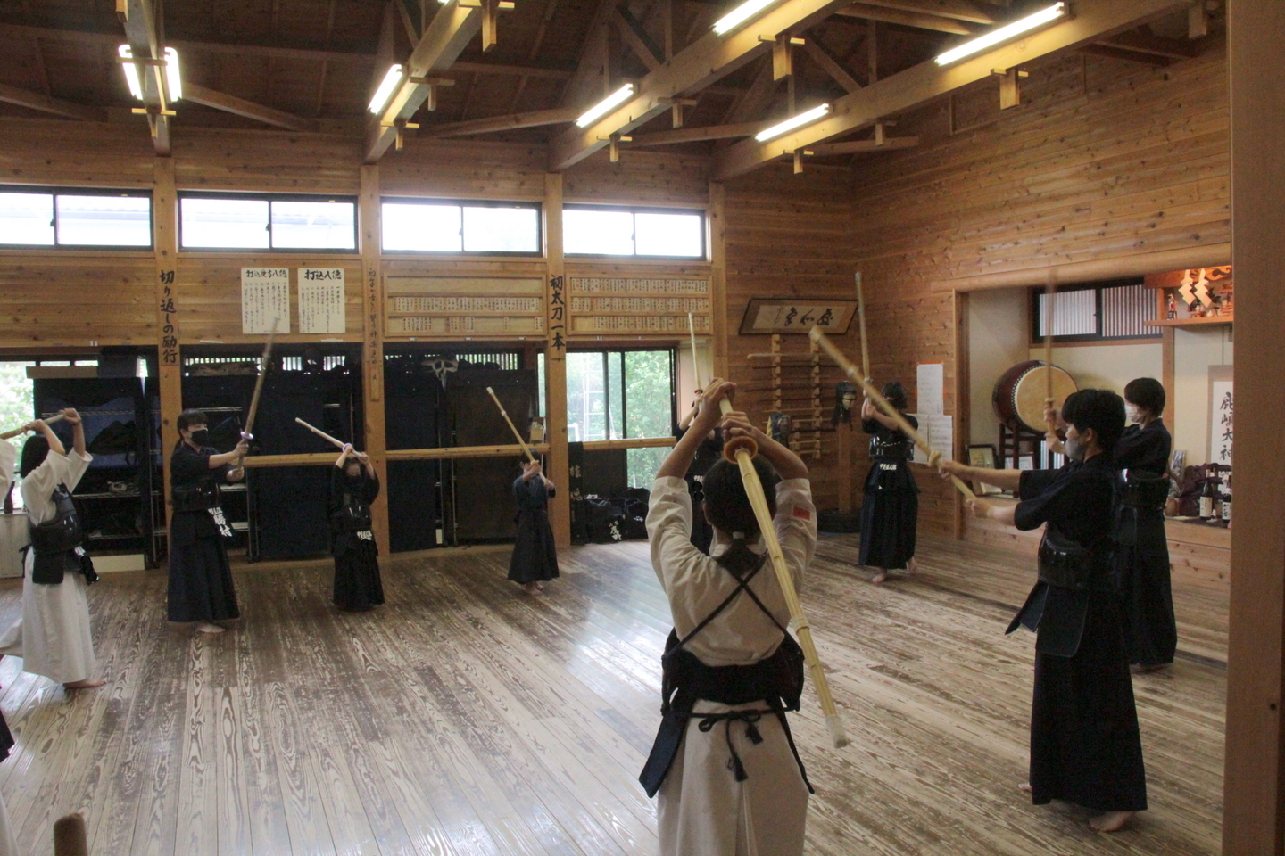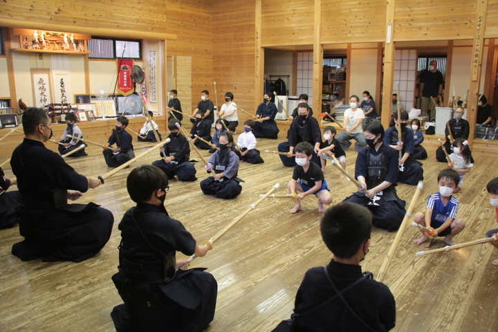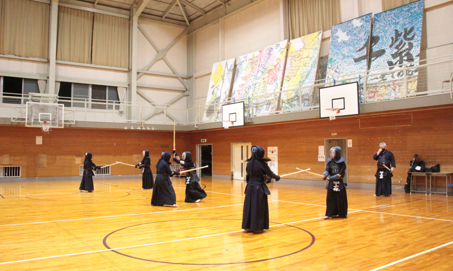 6月28日の甲斐直心館水曜通常稽古(玉幡中学校)には51人が参加しました。館生、指導者、一般、高校生の参加がありました。この日は夕立もあり、体育館内の温度は25度、湿度は75%と非常に蒸し暑い状況でしたので、感染予防対策に加え、熱中症対策も呼び掛けました。