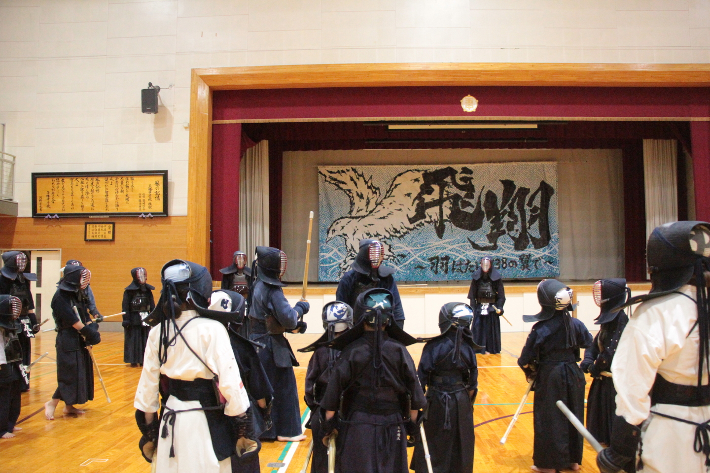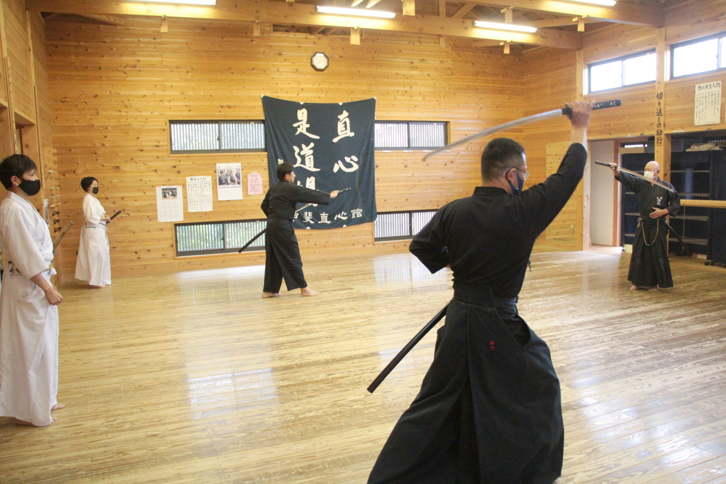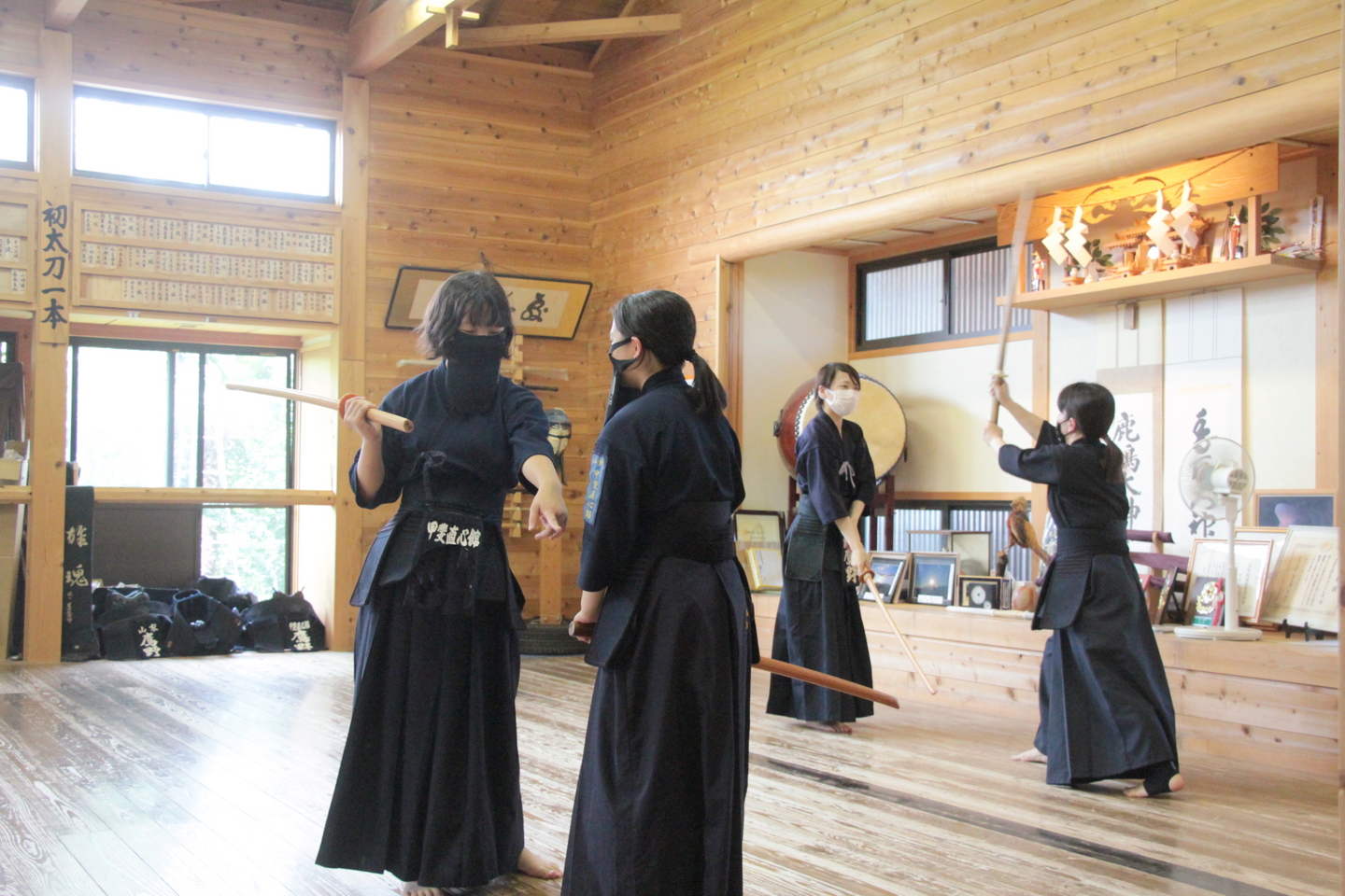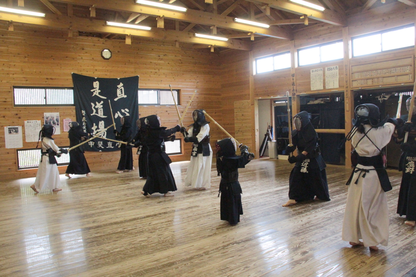 6月28日の甲斐直心館水曜通常稽古(玉幡中学校)には51人が参加しました。館生、指導者、一般、高校生の参加がありました。この日は夕立もあり、体育館内の温度は25度、湿度は75%と非常に蒸し暑い状況でしたので、感染予防対策に加え、熱中症対策も呼び掛けました。