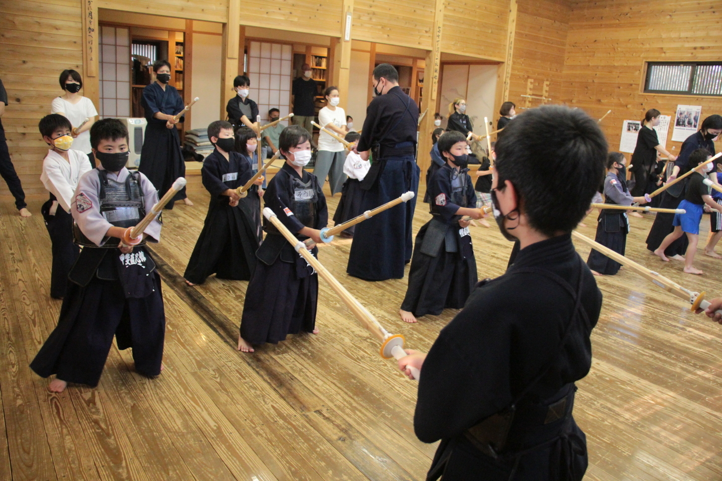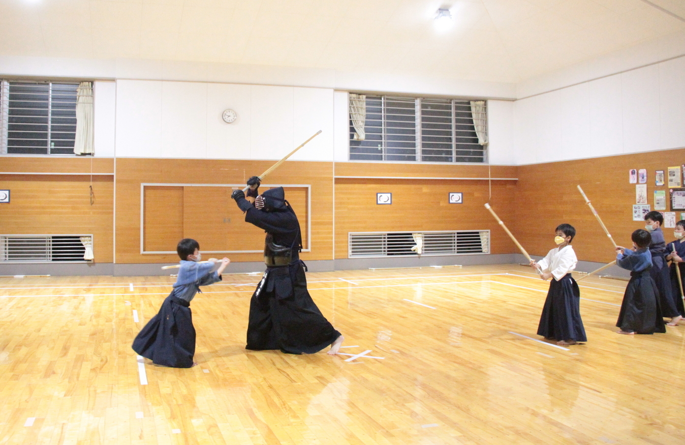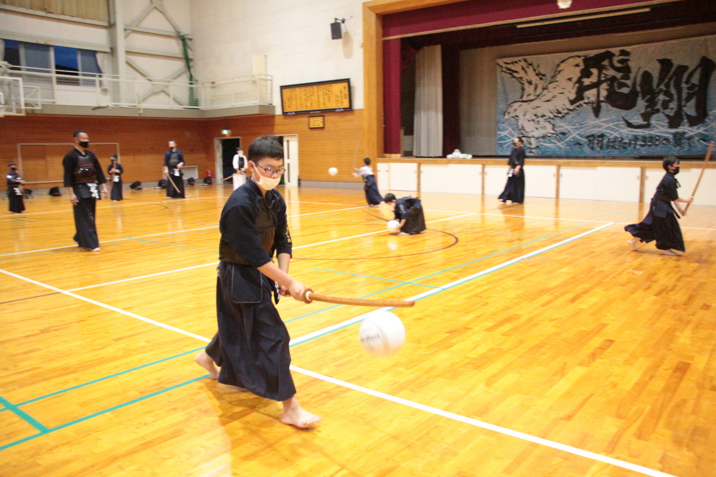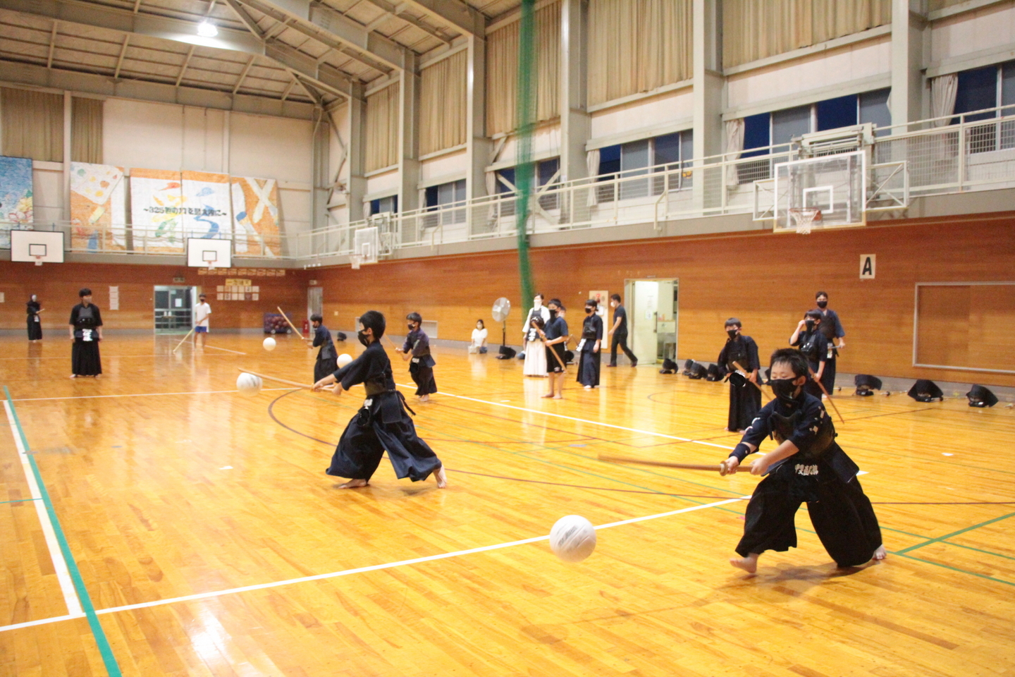 小学生の面着け組約20人は、バレーボールでのすり足ドリブルを4チームに分かれてリレーを行いました。慣れてきた子どもはバレーボールの跳ね返りも予測できるようになってきました。バレーボールの跳ね返りを待つ「溜め(ため)」ができるようになると剣道の技も増えるはずです。 面着け後は20分間。面着け一番乗りは小4男子2人でした。切り返しを3〜4回行い、相面、出小手を修錬し、地稽古を4回行いました。出小手の打ち方については、右手で振り上げるのではなく、左肘を意識することを説明しました。