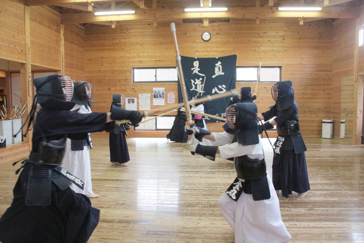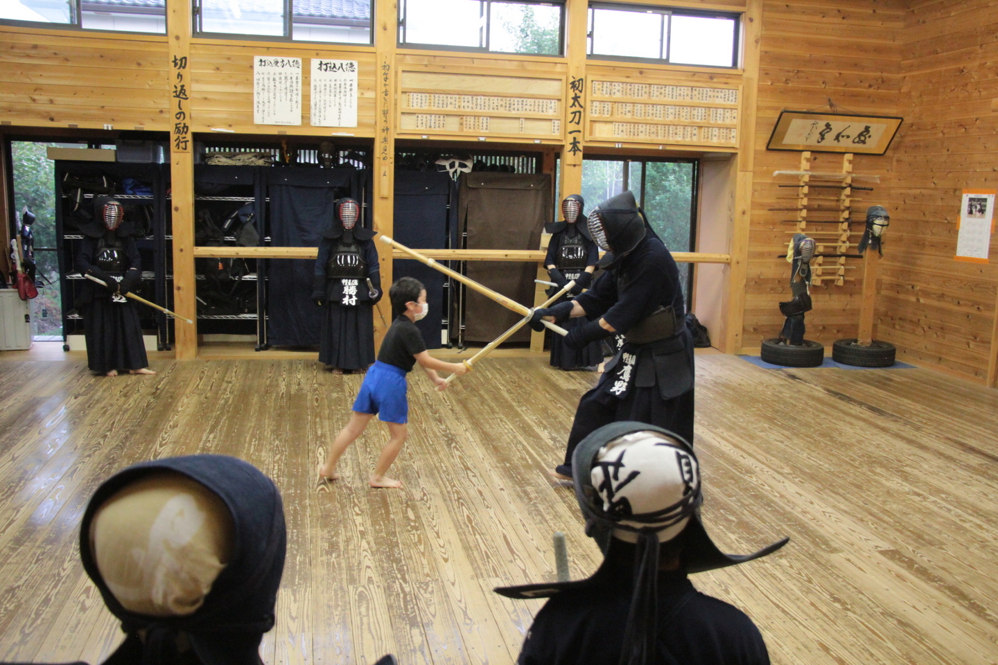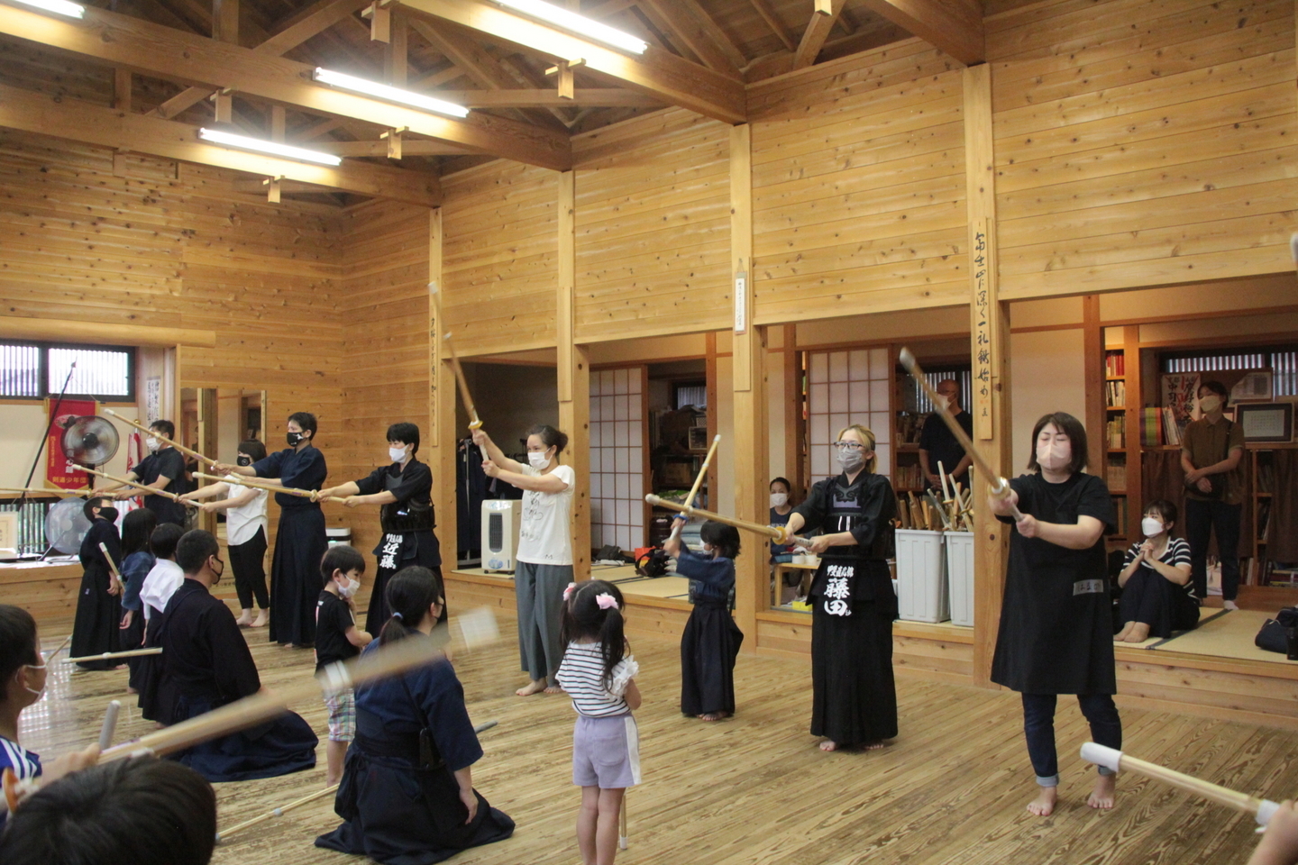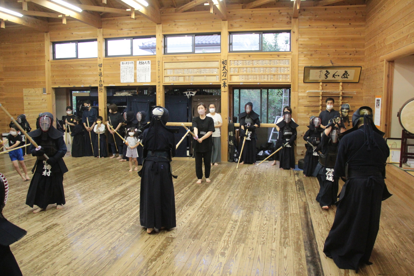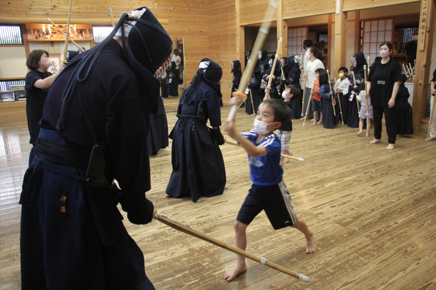 小学生の面着け組約20人は、バレーボールでのすり足ドリブルを4チームに分かれてリレーを行いました。慣れてきた子どもはバレーボールの跳ね返りも予測できるようになってきました。バレーボールの跳ね返りを待つ「溜め(ため)」ができるようになると剣道の技も増えるはずです。 面着け後は20分間。面着け一番乗りは小4男子2人でした。切り返しを3〜4回行い、相面、出小手を修錬し、地稽古を4回行いました。出小手の打ち方については、右手で振り上げるのではなく、左肘を意識することを説明しました。