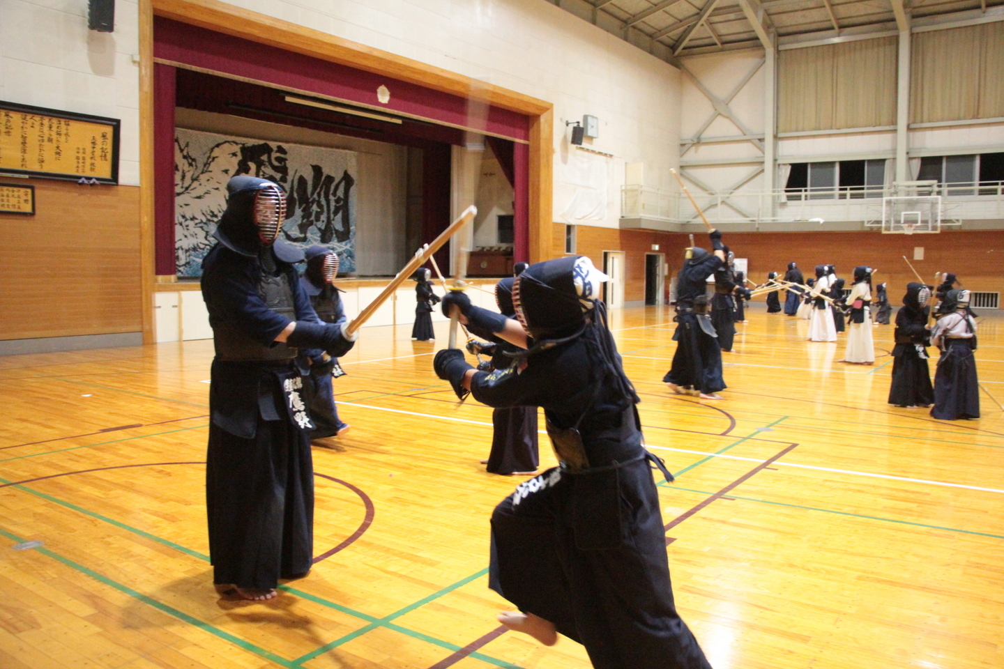 号令は中3小林さん。正座のあと、準備体操、補強運動、8種類の素振り200本を行いました。以降は中学生以上と小学生以下に分かれて稽古をしました。