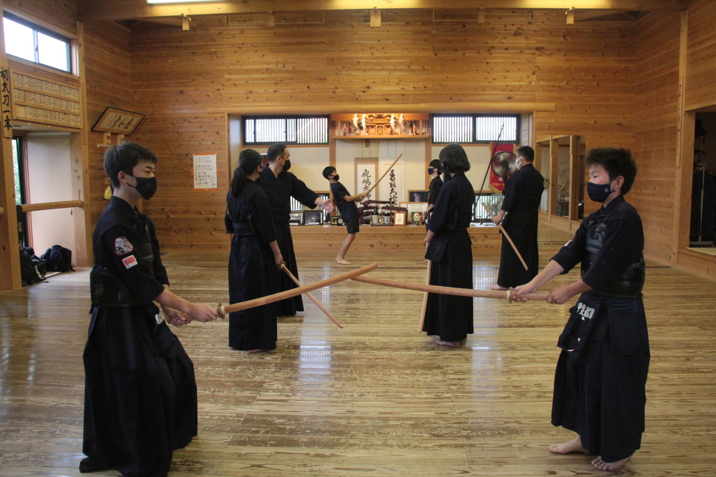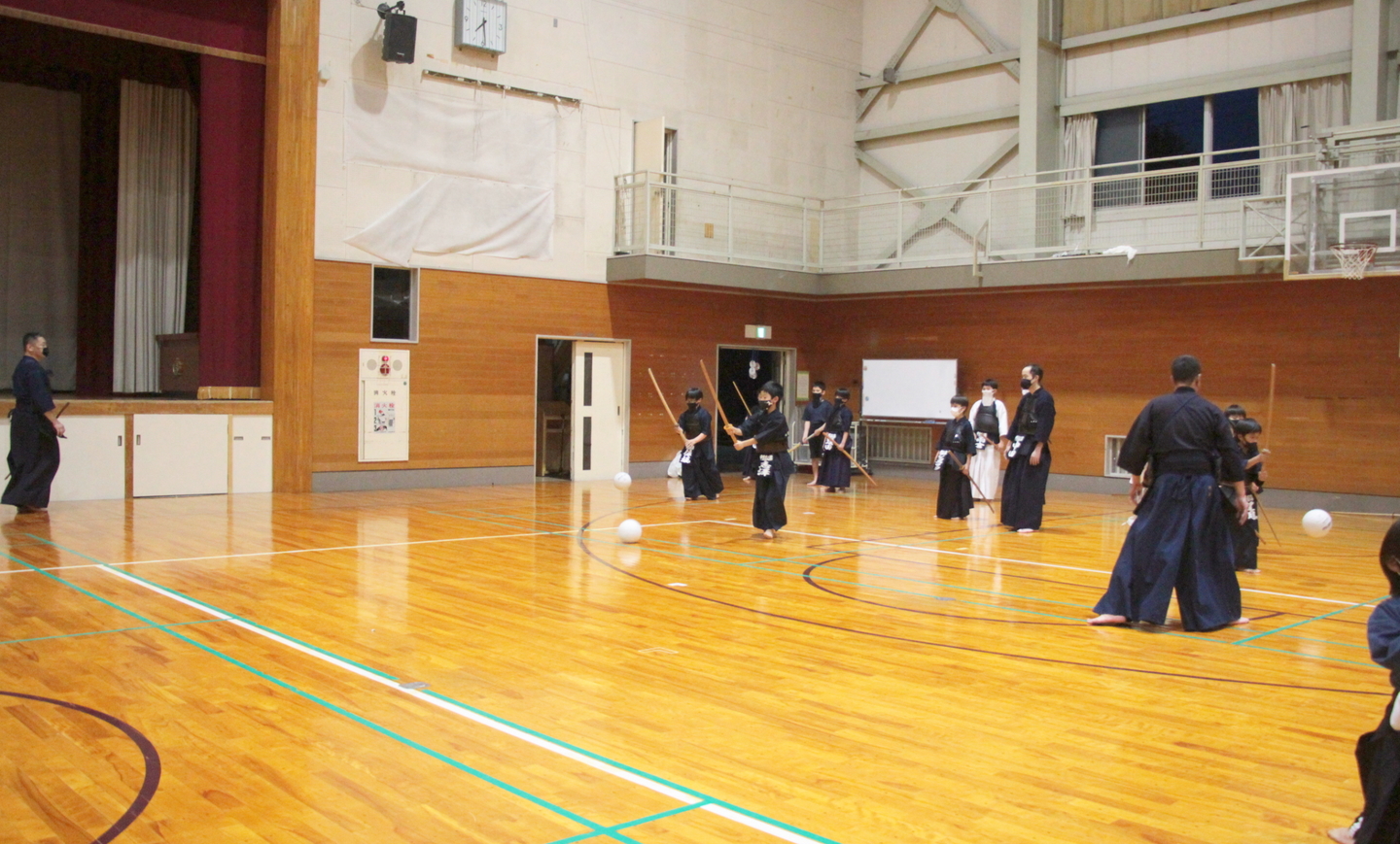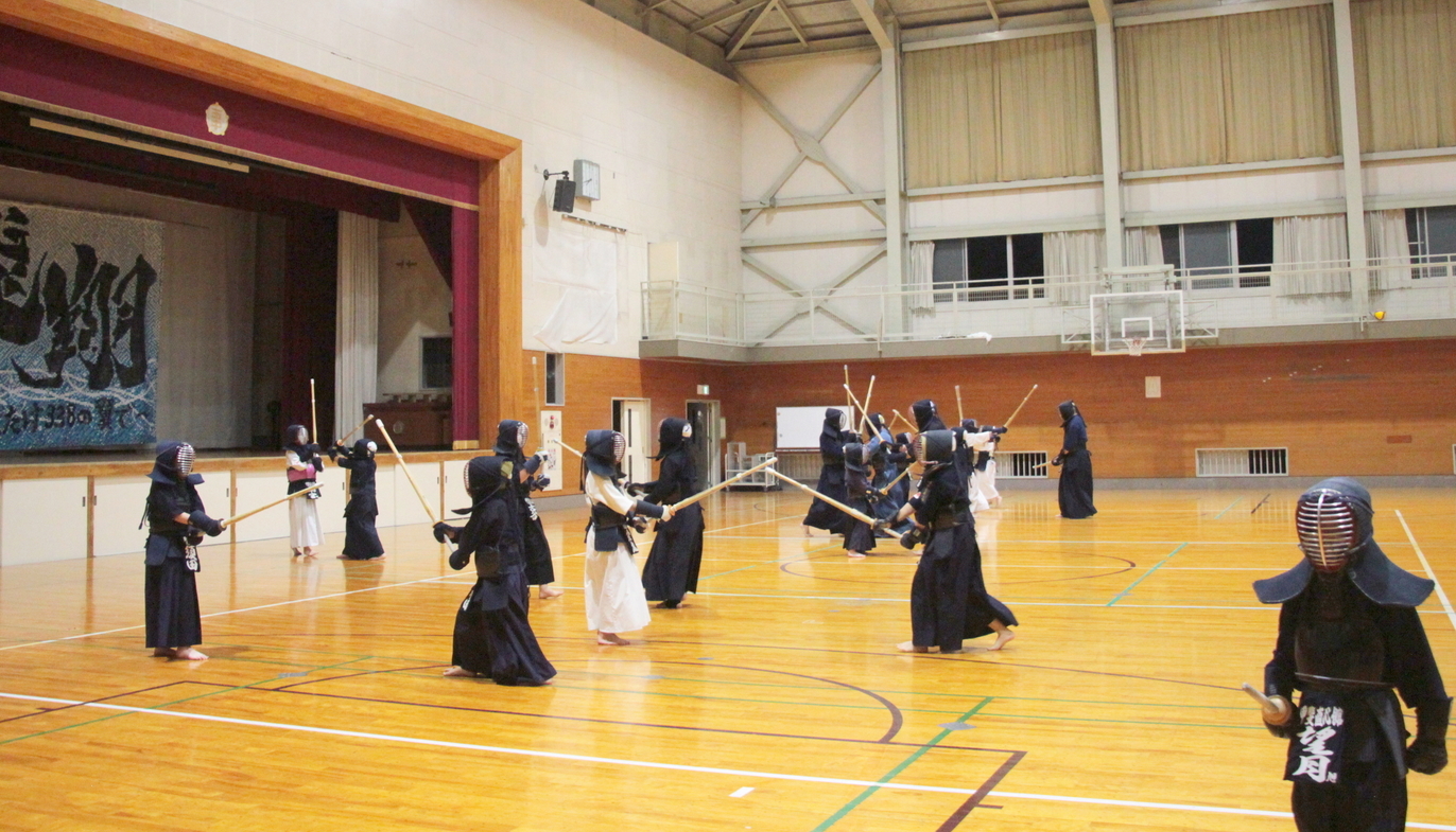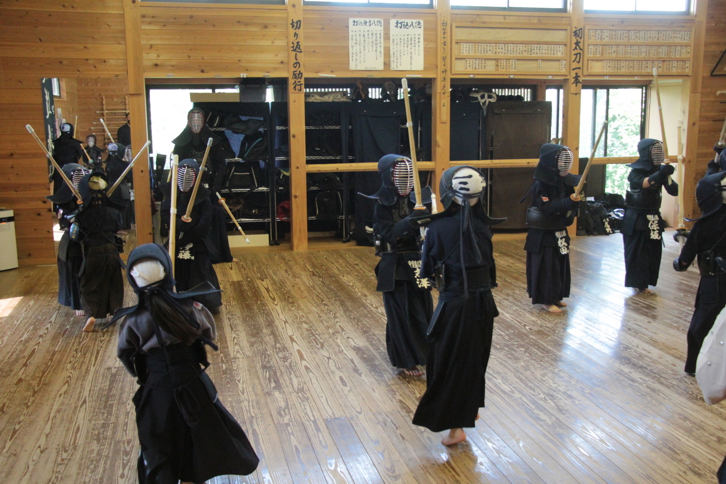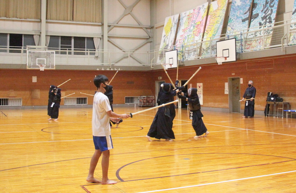 面着け後は20分間。面を着けた順に切り返しを始め、3〜4人一組に分かれてさらに切り返しを重点に行いました。送り足での前進後退がまっすぐ移動できるかどうかを確認してください。元立ちの真正面に立って切り返しを行います。大きく振りかぶって振り下ろすと、正しい軌道に振りやすいです。顔の前で振ると、左手が上下ではなく、左右に移動しやすいことになります。 相面を行い、地稽古を行いました。ここでも積極的に技を出していくことが大切です。 面を着けていない「初心者の初心者」が約10人いましたので、宮本先生に指導を受けた後、館生元立ちで面打ち、小手面打ちなどを行いました。まずまず元気がありました。 通常、試合は朝早くから始まります。朝稽古で体が動くよう習慣をつけておけば、試合でも審査でも自ずから結果はついてくるはずです。