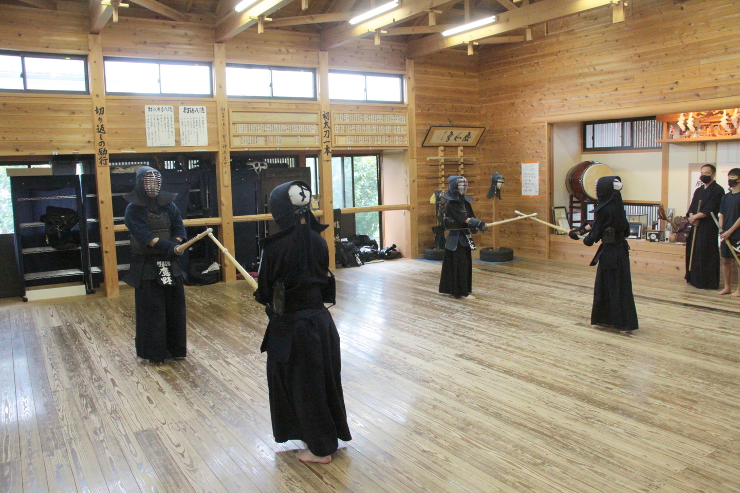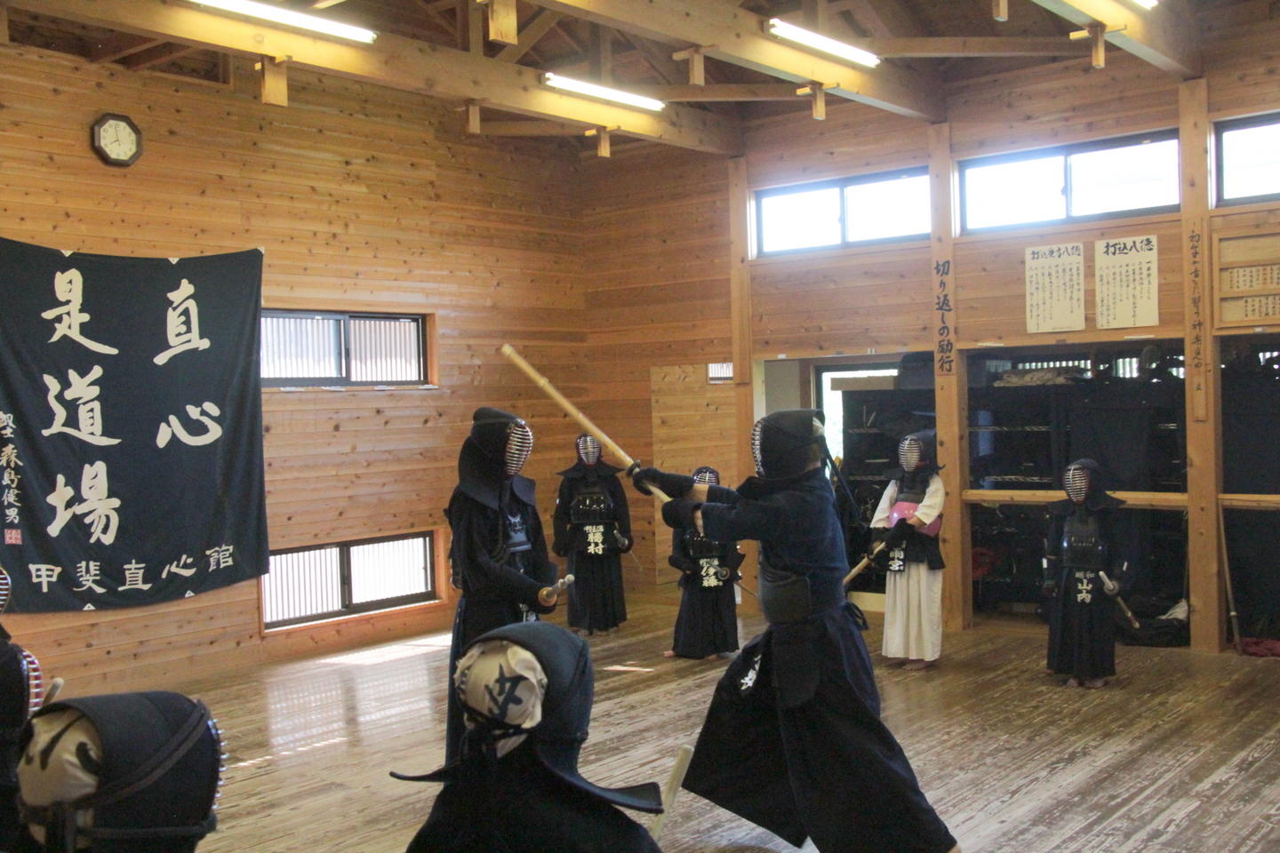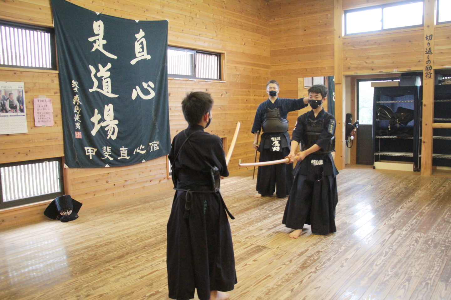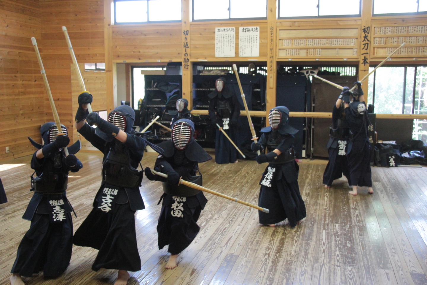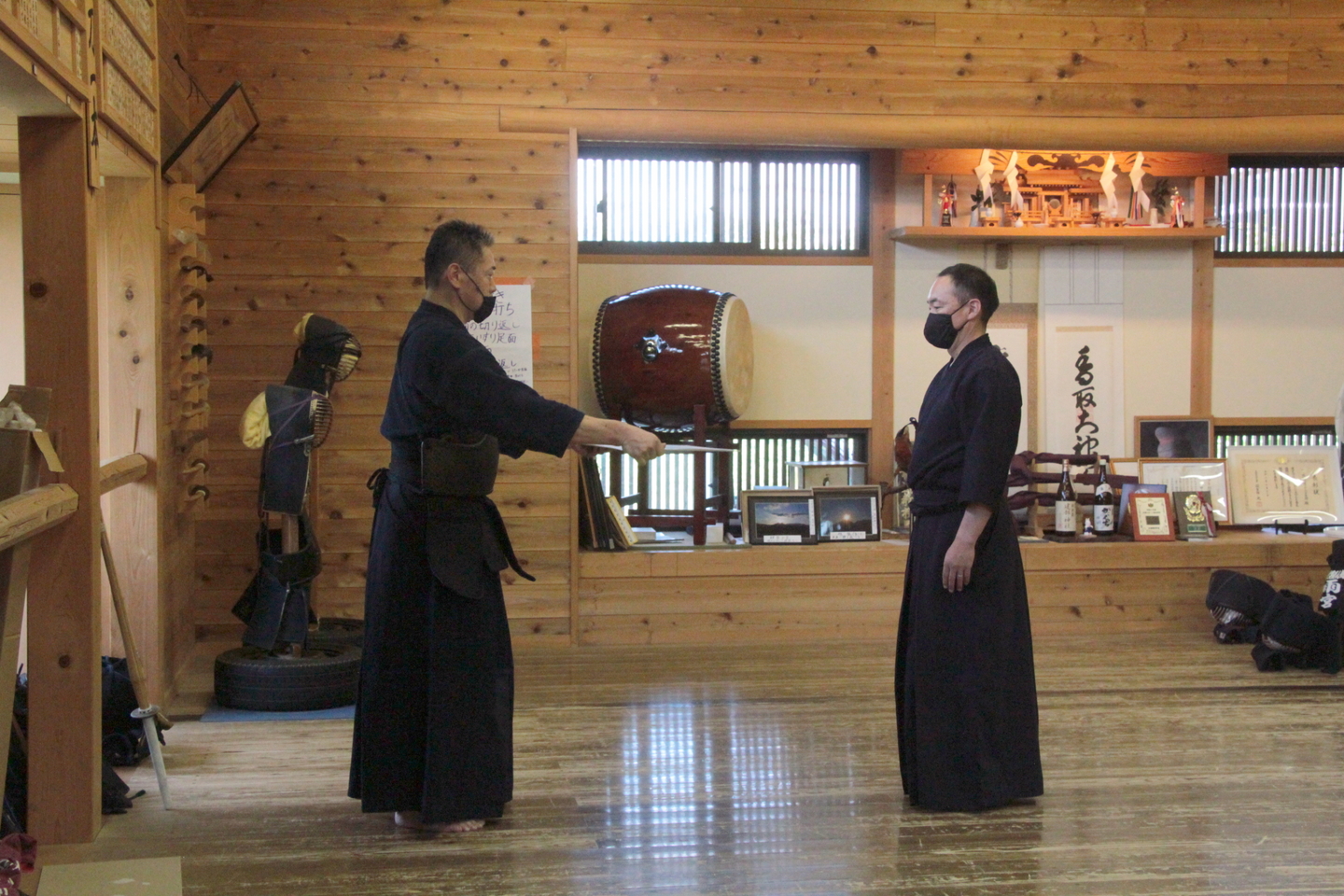 面着け後は20分間。面を着けた順に切り返しを始め、3〜4人一組に分かれてさらに切り返しを重点に行いました。送り足での前進後退がまっすぐ移動できるかどうかを確認してください。元立ちの真正面に立って切り返しを行います。大きく振りかぶって振り下ろすと、正しい軌道に振りやすいです。顔の前で振ると、左手が上下ではなく、左右に移動しやすいことになります。 相面を行い、地稽古を行いました。ここでも積極的に技を出していくことが大切です。 面を着けていない「初心者の初心者」が約10人いましたので、宮本先生に指導を受けた後、館生元立ちで面打ち、小手面打ちなどを行いました。まずまず元気がありました。 通常、試合は朝早くから始まります。朝稽古で体が動くよう習慣をつけておけば、試合でも審査でも自ずから結果はついてくるはずです。