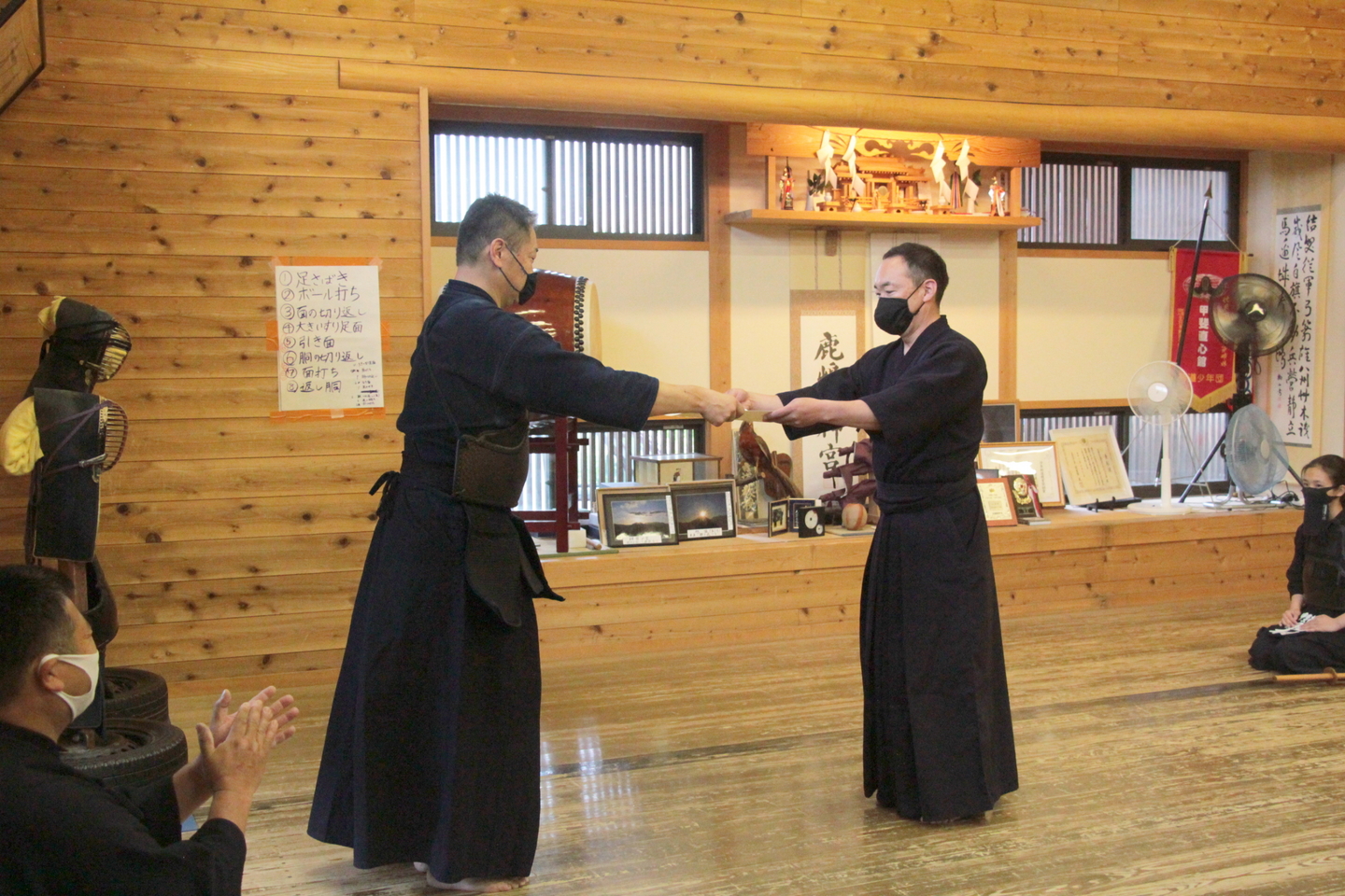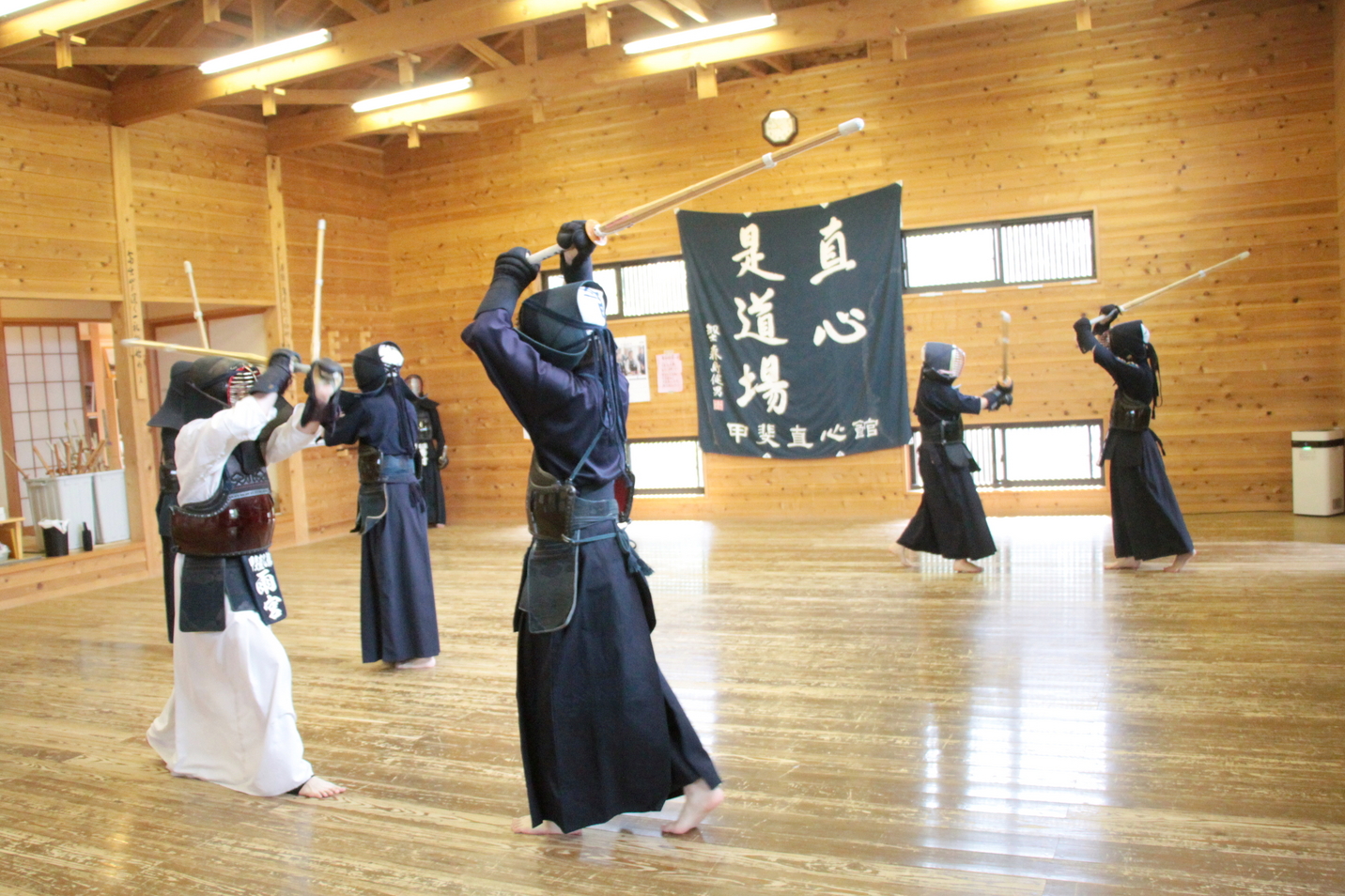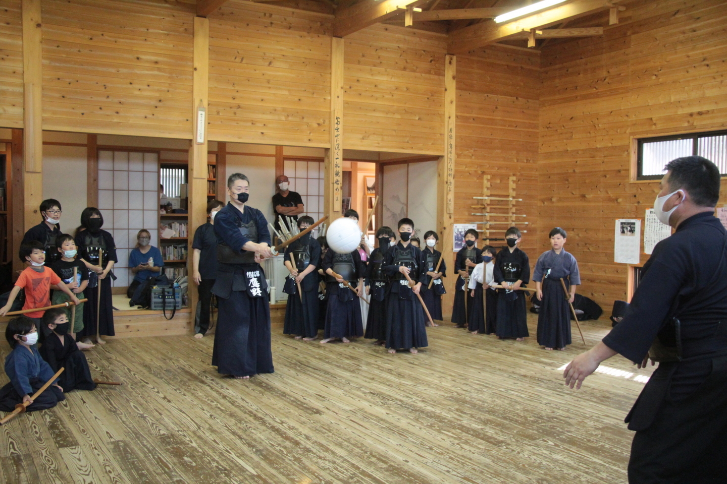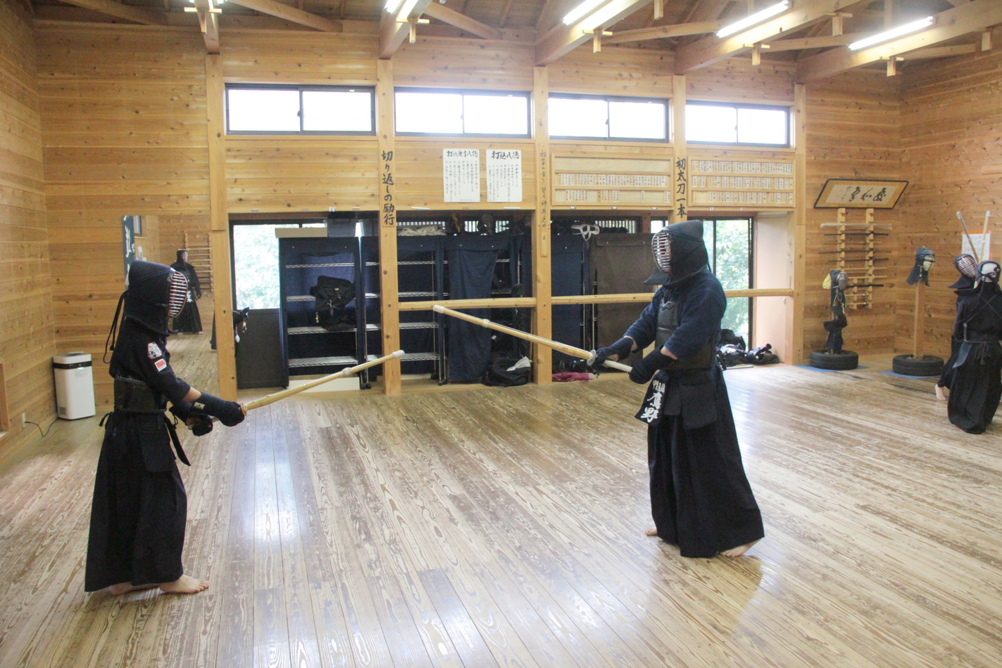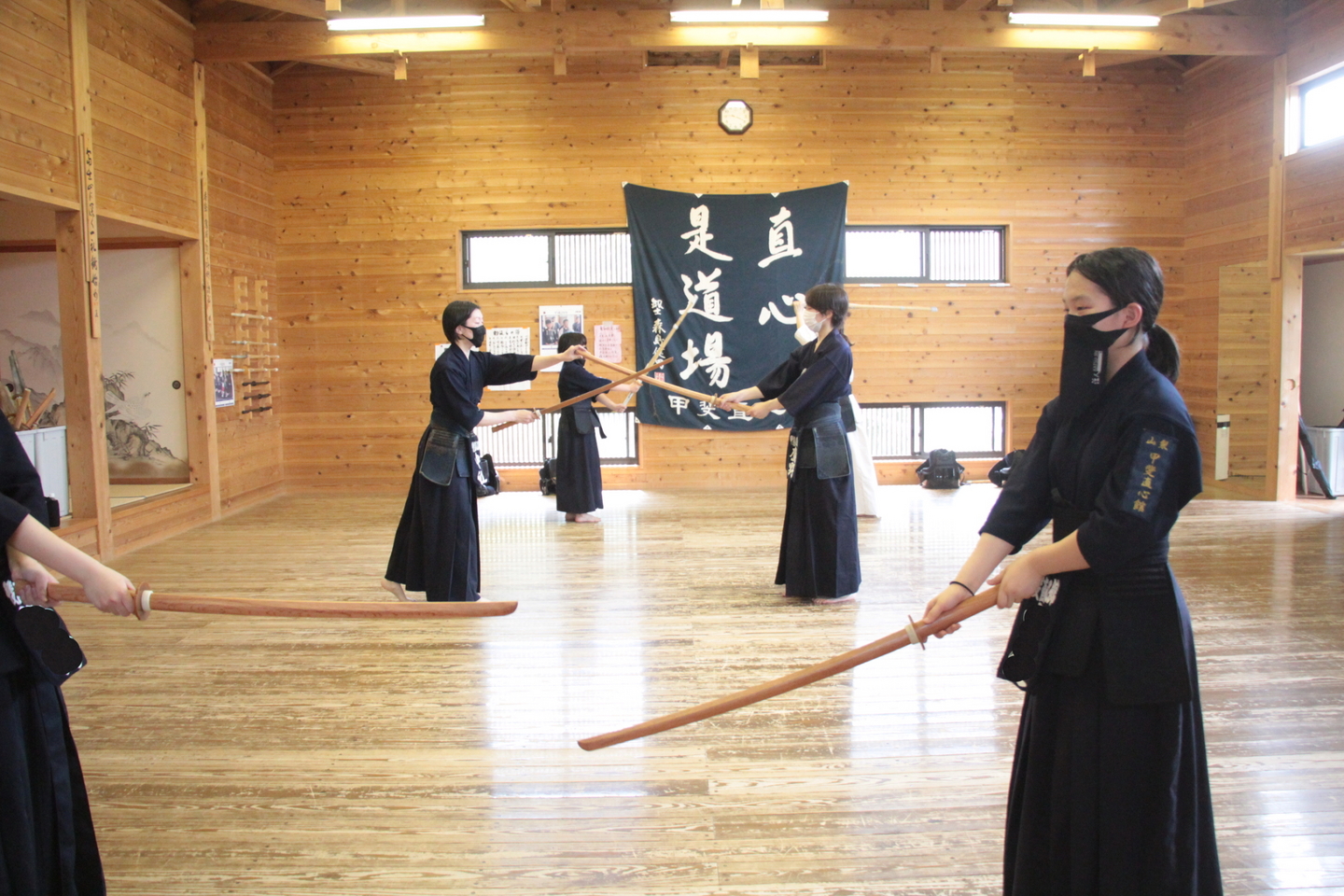 面着け後は20分間。面を着けた順に切り返しを始め、3〜4人一組に分かれてさらに切り返しを重点に行いました。送り足での前進後退がまっすぐ移動できるかどうかを確認してください。元立ちの真正面に立って切り返しを行います。大きく振りかぶって振り下ろすと、正しい軌道に振りやすいです。顔の前で振ると、左手が上下ではなく、左右に移動しやすいことになります。 相面を行い、地稽古を行いました。ここでも積極的に技を出していくことが大切です。 面を着けていない「初心者の初心者」が約10人いましたので、宮本先生に指導を受けた後、館生元立ちで面打ち、小手面打ちなどを行いました。まずまず元気がありました。 通常、試合は朝早くから始まります。朝稽古で体が動くよう習慣をつけておけば、試合でも審査でも自ずから結果はついてくるはずです。