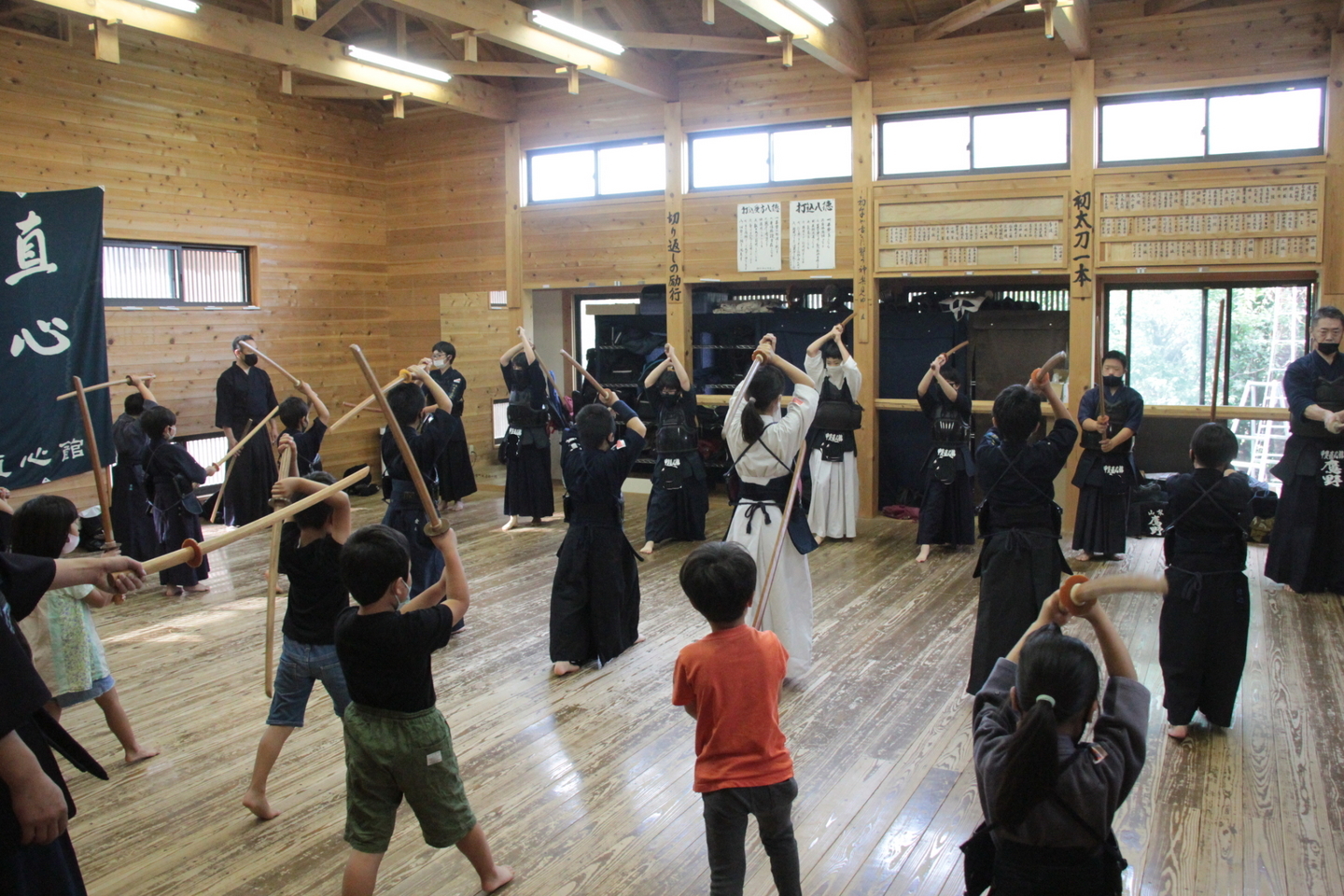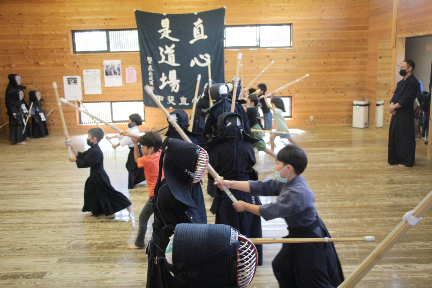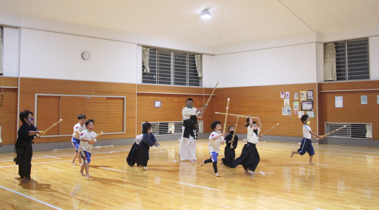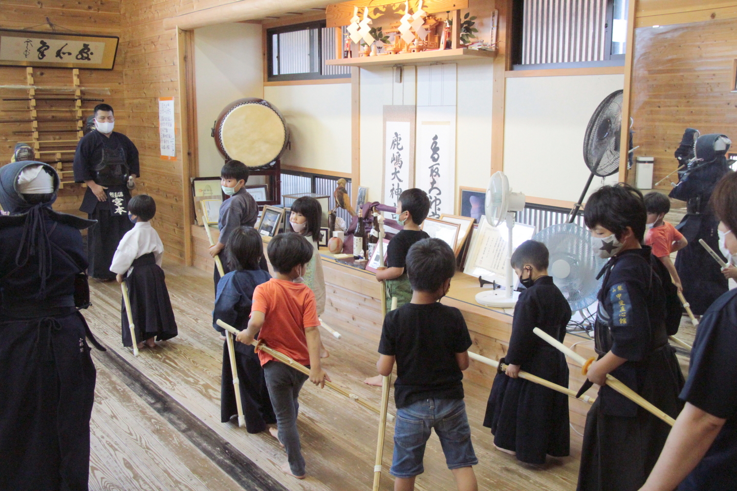 小6雨宮さんの号令で正座。正式入門した小1男子を紹介しました。一緒に剣道を学んでいきましょう。 8種類の素振り計200本を行いました。