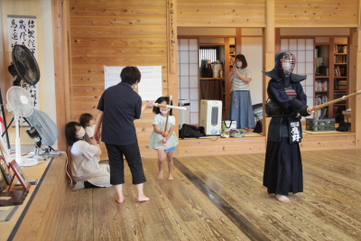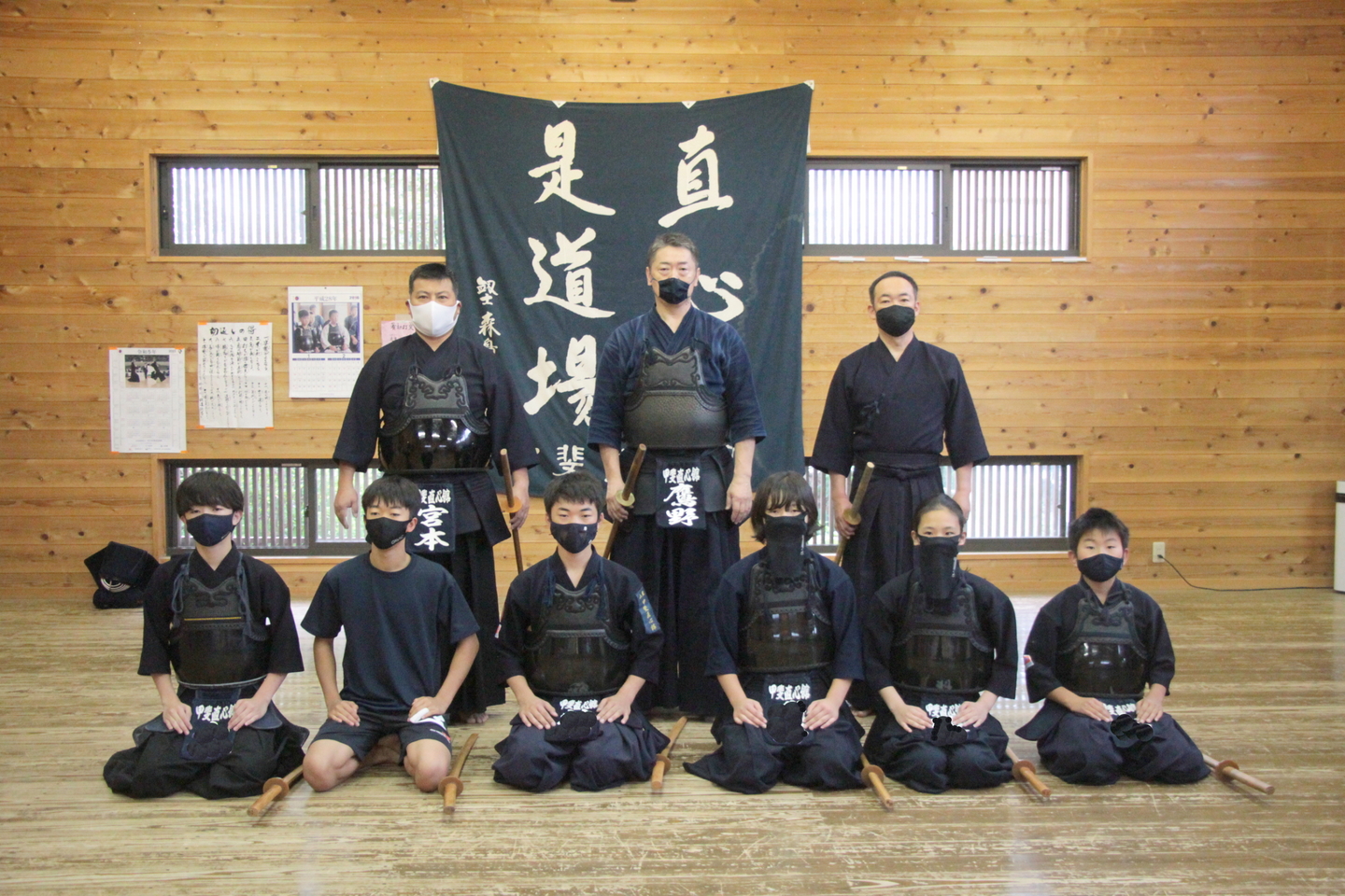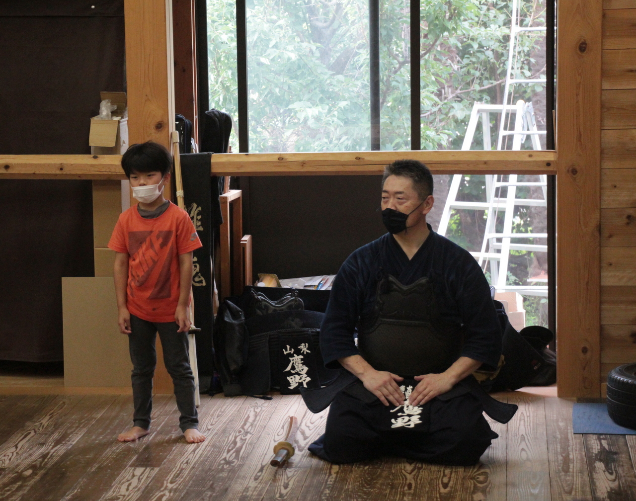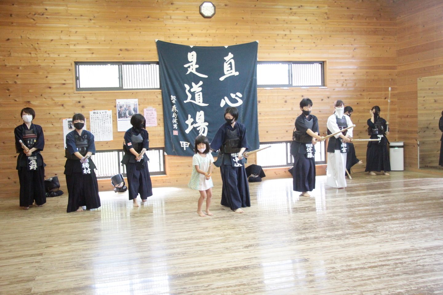 小6雨宮さんの号令で正座。正式入門した小1男子を紹介しました。一緒に剣道を学んでいきましょう。 8種類の素振り計200本を行いました。