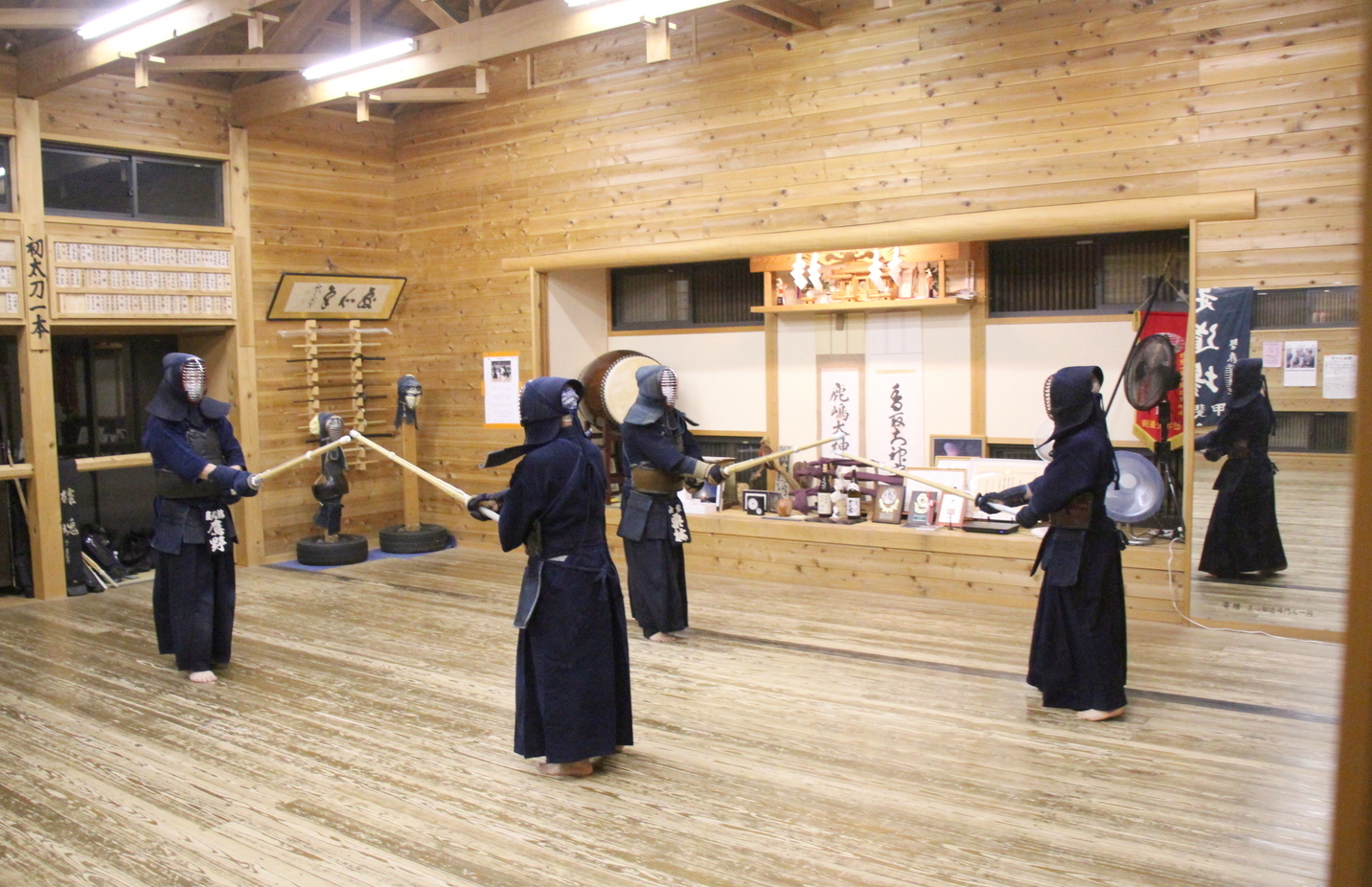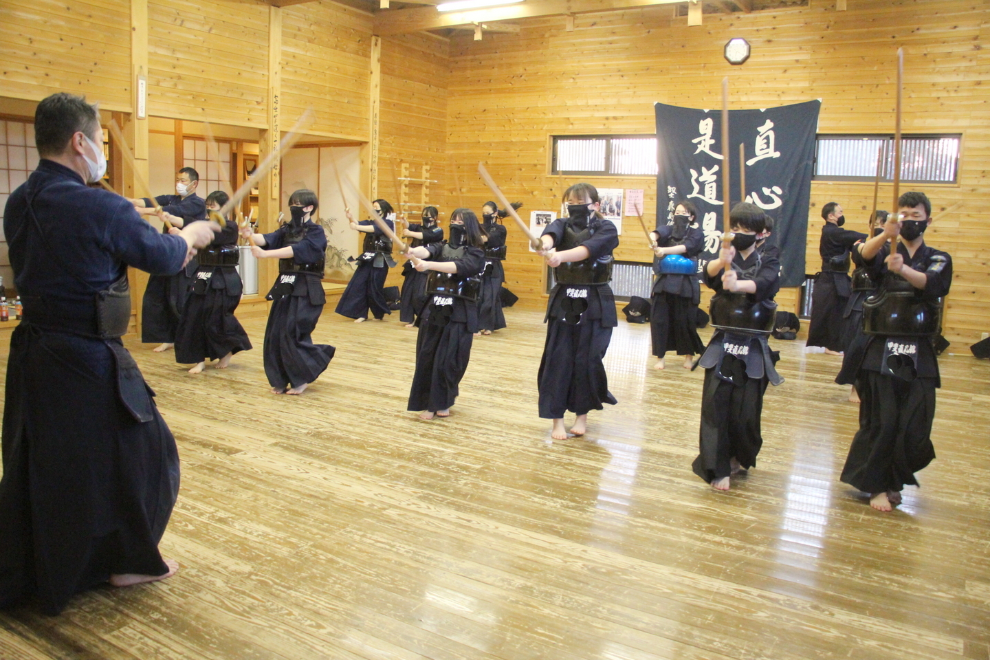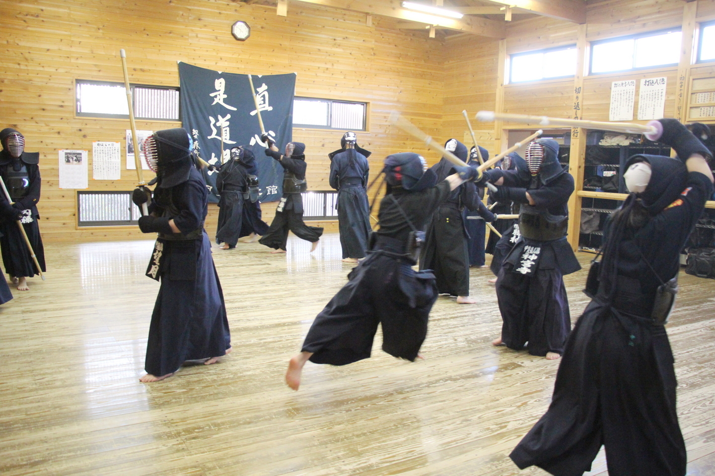 中3長谷部さんの号令で正座。8種類の素振りを行い、足さばき、日本剣道形、木刀による剣道基本技稽古法を修錬し、面着け後は切り返し、面打ちを行い、指導者元立ちで掛かり稽古をして地稽古、切り返しで締めました。