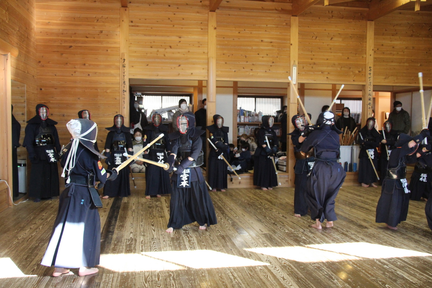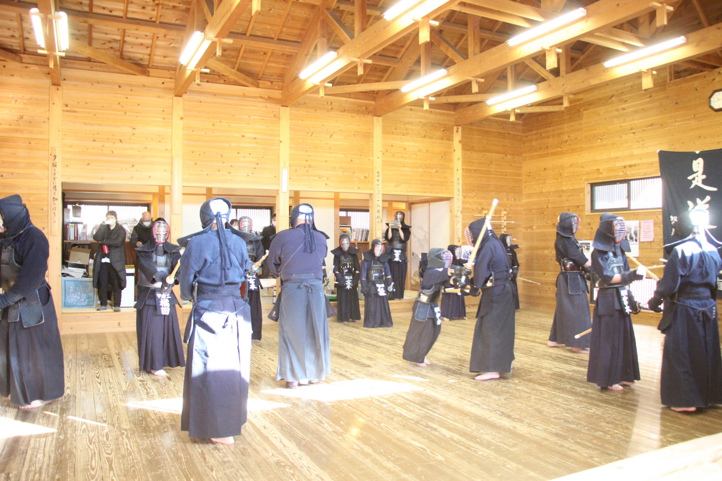 当初参加を予定されていた外部の先生方3人が体調不良などで欠席されましたが、火曜一般稽古会にもお越しいただいている塩釜悦男教士七段、音楽家の有泉芳史三段にもご参加をいただき、甲斐直心館では指導者・一般のほか、九州から帰省した大学生、同じく高校生、また県内高校に通う高校生、中学生、小学生、見学の幼児が参加しました。
