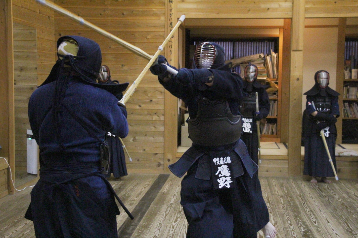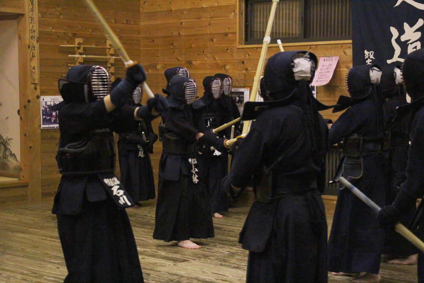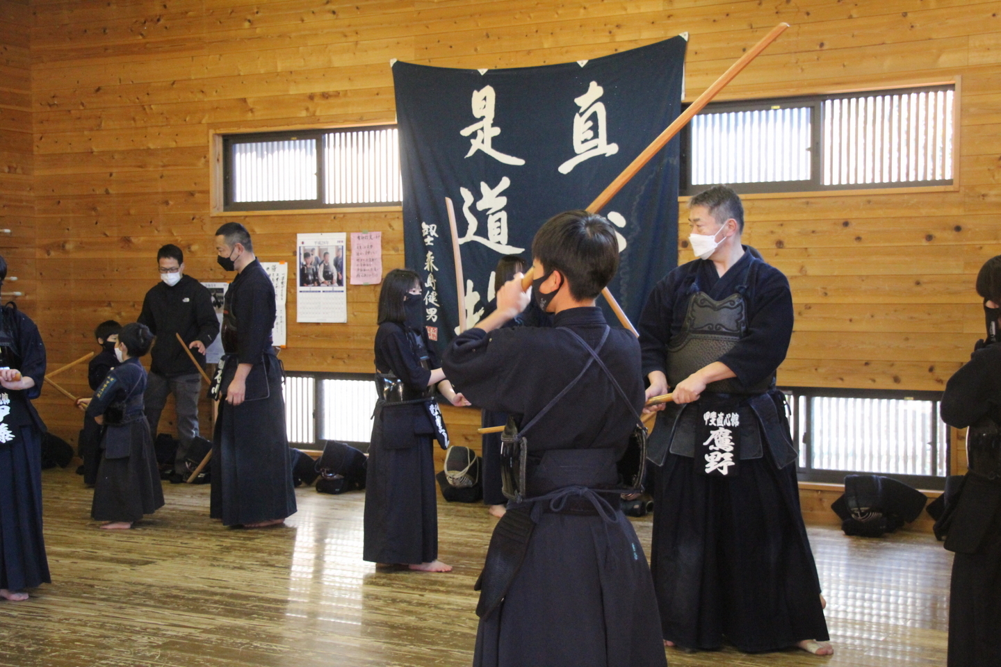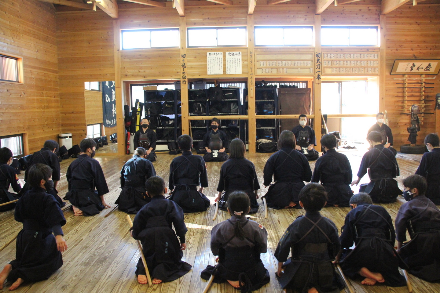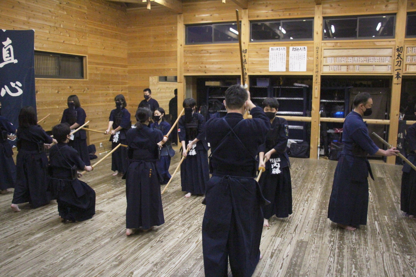 全員で円くなり、正面素振りを50本して面着け。切り返しの後、先生方元立ちで面打ち、指導稽古を行い、中学生〜大学生による地稽古、小中学生による地稽古を行い、最後に指導者・一般による地稽古を行い、切り返しで稽古を締めました。