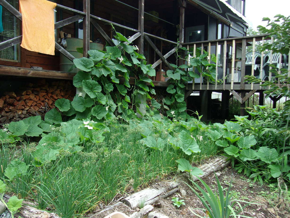 ニラの畝を埋め尽くしベランダのテラスによじ登ってきました