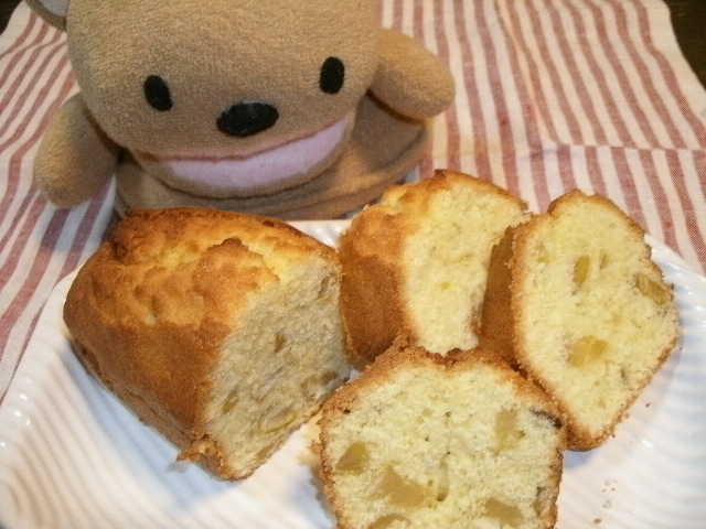 いつものパウンドケーキに割れた栗を混ぜて、香り付けにラム酒(ホントはブランデーがいいんだけど うちになかった・・・)を大さじ1入れて焼きました〜
