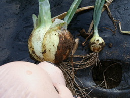 玉ねぎの葉っぱがたおれて、