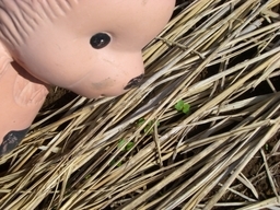 ワラのすきまから、くるしそうに かお出してる!