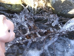 いきおいよくながれてくる水しぶきが、えだにとんで、こおりになってる
