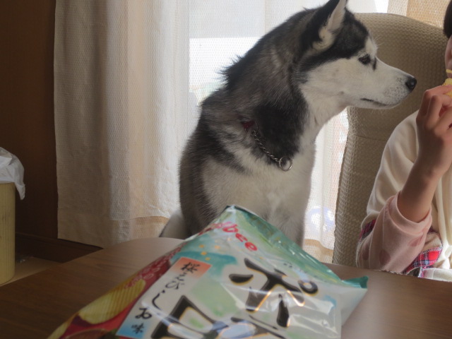 スナック菓子を食べる長女の手を期待の目で見つめるジル困った