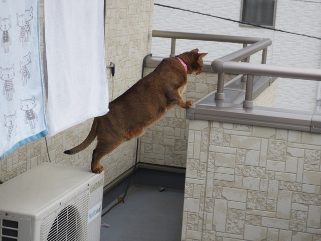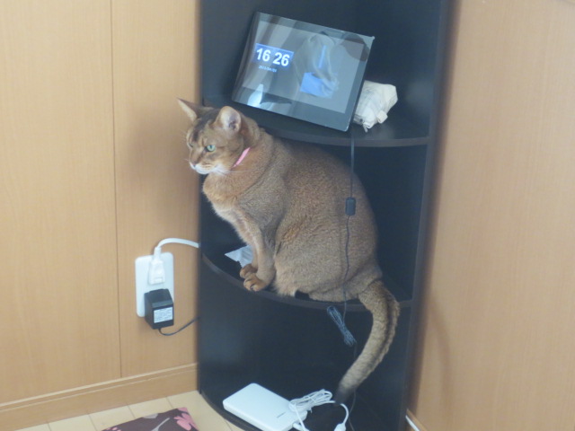 お姉ちゃんが帰ってきて遊びのお誘いしたけど、お姉ちゃんは携帯に夢中で遊んでくれず・・・夕方、私が近所のお宅に生協さんで注文した品物を引き取りに行き戻ると、何故かアンが棚の中段に上ってます