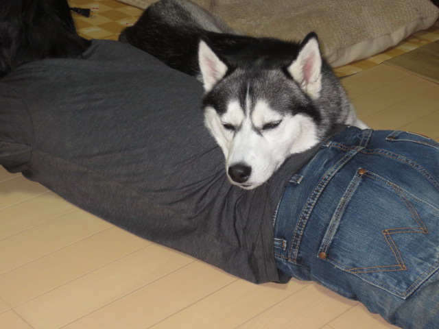 その後、場所を変えてもパパの腰に顔を乗せてウトウト眠い